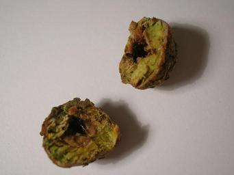 Keywords: Cola-nut Gall Andricus lignicola.JPG en Cola-nut galls Andricus lignicola cut open to see the internal chamber Own Rosser1954 Roger Griffith 03/11/2008 From Speir's School grounds Beith North Ayrshire Scotland Galls