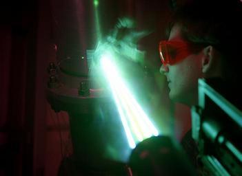 | Keywords: propulsion laser propulsionlaser x-33 x33 An engineer at the Marshall Space Flight Center (MSFC) Wind Tunnel Facility uses lasers to measure the velocity and gradient distortion across an eight inch curved pipe with joints and turning valves during a cold-flow propulsion research test; simulating the conditions found in the X-33's hydrogen feedline. Lasers are used because they are non-intrusive and do not disturb the flow like a probe would. The feedline supplies propellants to the turbo pump. The purpose of this project was to design the feedline to provide uniform flow into the turbo pump. An engineer at the Marshall Space Flight Center (MSFC) Wind Tunnel Facility uses lasers to measure the velocity and gradient distortion across an eight inch curved pipe with joints and turning valves during a cold-flow propulsion research test; simulating the conditions found in the X-33's hydrogen feedline. Lasers are used because they are non-intrusive and do not disturb the flow like a probe would. The feedline supplies propellants to the turbo pump. The purpose of this project was to design the feedline to provide uniform flow into the turbo pump. |
