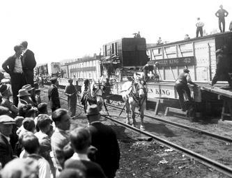 | Keywords: Cole Bros. Circus WDL10699.png Artwork ru Атвелл Га и А 1879 1957 гг fr Atwell Harry A 1879-1957 en Atwell Harry A 1879-1957 zh 哈里·A·阿特韦尔,1879-1957 年 pt Atwell Harry A 1879-1957 ar هاري أ أتويل، 1879-1957 es Atwell Harry A 1879-1957 ru Ци к б атьев Коул fr Cirque des frères Cole en Cole Bros Circus zh 科尔兄弟马戏团 pt Circo dos Irmãos Cole ar سيرك الإخوة كول ru а этом изоб ажении 1935 г показан обычный для XX-го века аме иканский ци к с еднего азме а Толпа смот ит как г узовые фу гоны ци ка б атьев Коул г узят на платфо мы а железнодо ожных вагонах стоит ма ки овка Клайда Битти и Аллена Кинга кото ые были самыми известными д есси овщиками того в емени За платфо мами видны г узовые вагоны в кото ых пе евозили слонов и тягловых лошадей Эта сцена повто ялась ежедневно ут ом и вече ом на железнодо ожных станциях в Соединенных Штатах Ци к б атьев Коул был основан в 1884 г Уильямом Вашингтоном Коулом 1847 1915 гг под названием овое колоссальное шоу У В Коула Сезон 1935 года был пе вым когда легенда ный Битти п исоединился к ци ку б атьев Коул В то в емя ци к пе едвигался на 35 двойных железнодо ожных вагонах и о ганизовывал гигантский уличный па ад от железнодо ожной станции до ци ковой площадки С еди го одов посещенных ци ком б атьев Коул в 1935 г были Бентон Ха бо штат ичиган; а иетта штат Огайо; Фоллс Сити штат еб аска; Литл-Рок штат А канзас <br>Битти Клайд 1903 1965 гг ; Ци к; Ци ковые а тисты; Ци к б атьев Коул; Скопление людей; А тисты; Лошади; Кинг Аллен; Железнодо ожные вагоны fr Cette image de 1935 montre une scène d'un cirque américain typique de taille moyenne au XX<sup>e</sup> siècle La foule regarde alors que les chariots de bagages du cirque des frères Cole sont tirés sur des wagons plats Les wagons portent l'inscription des noms Clyde Beatty et Allen King deux des dompteurs les plus célèbres de l'époque Derrière eux les wagons à bestiaux contenaient les éléphants et les chevaux qui portaient les bagages Cette scène se répétait tous les jours matin et soir dans les gares de triage des communautés à travers les États-Unis Fondé en 1884 par William Washington Cole 1847 1915 le cirque des frères Cole était appelé « Les nouveaux spectacles colossaux de W W Cole » L'année 1935 marqua la première saison où le légendaire Beatty fut associé au cirque des frères Cole l'époque le cirque était transporté sur 35 wagons de double longueur et présentait une parade de rue gigantesque qui défilait de la gare de triage au site du cirque Benton Harbor dans le Michigan Marietta en Ohio Falls City dans le Nebraska et Little Rock en Arkansas comptent parmi les villes et les villages que le cirque des frères Cole visita en 1935 <br>Beatty Clyde 1903-1965; Cirque; Artistes de cirque; Cirque des frères Cole; Foules; Artistes; Chevaux; King Allen; Wagons de chemin de fer en This 1935 image presents a scene from a typical moderate-sized 20th-century American circus A crowd watches as baggage wagons from the Cole Bros Circus are being pulled over flatcars The railcars are marked Clyde Beatty and Allen King who were two of the more notable animal trainers of the period Behind the flatcars are stock cars that held elephants and baggage horses This scene was repeated daily morning and night in railroad yards in communities across the United States Cole Bros Circus was established in 1884 by William Washington Cole 1847 1915 as W W Cole s New Colossal Shows 1935 was the first season in which the legendary Beatty was associated with the Cole Bros Circus At that time the circus was transported on 35 double-length railroad cars and featured a giant street parade from the railroad yards to the circus grounds Towns and cities visited by the Cole Bros Circus in 1935 included Benton Harbor Michigan; Marietta Ohio; Falls City Nebraska; and Little Rock Arkansas <br>Beatty Clyde 1903-1965; Circus; Circus performers; Cole Brothers Circus; Crowds; Entertainers; Horses; King Allen; Railroad cars zh 这张 1935 年的照片拍摄的是 个中等规模的 20 世纪典型美国马戏团 照片上,科尔兄弟马戏团由平 车拖拉行进,旁边 人群围观 火车上标 克莱德·比蒂 Clyde Beatty 和艾伦·金 Allen King 的名字,两人是当时著名的动物训练员 平 火车的后 是动物车,载 大象和托运行 的马匹 当时,这 景每天都会 美国各社区的铁路调运 反复出现 科尔兄弟马戏团成立于 1884 年,创始人是威廉·华盛顿·科尔(William Washington Cole,1847-1915 年),起 被称为 W·W·科尔全新大型表演 1935 年是传奇人物比蒂与科尔兄弟马戏团合 的第 个戏季 当时,马戏团使用了 35 节双 长度的 轨搬运车,庞大的街头行进队伍从铁路调运 直排到马戏团的 科尔兄弟马戏团 1935 年巡演过的城镇和城市包括密歇根州的 顿港 俄亥俄州的玛丽埃塔 内布拉斯加州的福尔斯城和阿肯色州的小石城 <br>克莱德·比蒂,1903-1965 年; 马戏团; 马戏团表演 ; 科尔兄弟马戏团; 人群; 艺人; 马; 艾伦·金; 