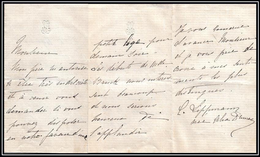 Keywords: Colett Dumas letter.jpg ru Письмо Колетт Дюма с п осбой п едоставить ложе теат а ей и ее отцу - Александ у Дюма сыну 2015-08-07 Письмо Колетт Дюма о посещении теат а с отцом Александ ом Дюма сыном Колетт Дюма other versions PD-old-70-1923 Uploaded with UploadWizard Colette Dumas |