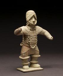| Keywords: Colima - Dancing Figure Whistle - Walters 20092029 - Three Quarter Right.jpg Dance among the most ephemeral of the arts was central to Mesoamerican civilization Dance performances as attested by their depiction on vases and other utilitarian objects such as this whistle typically encompassed rhythmic structured movement often by a group of people Music was a vital element frequently supplied by the dancers themselves Performances served to bring together the community by reifying shared beliefs of social behavior recounting seminal histories-both historical and mythic-and incarnating religious ideologies As communal theater performers were bedecked in ostentatious costumes that served to remove them from their social identities and the everyday reality of the community The elaborate costuming and staging also elevated the event from a simple entertainment to an impressive even iconic spectacle This festooned dancer bends his knees and stretches out his arms as if frozen in mid-motion Small holes in his hands likely accommodated dance fans or other performance accouterments Necklaces composed of round beads perhaps of precious jadeite and a variety of bands adorn his wrists and legs A wide neckpiece draped over the figure's shoulders and chest may have been made from pieces of cut shell His sleeveless shirt might represent a tufted textile or animal hide although it also recalls portrayals of the flayed skin of a sacrificial victim worn by celebrants as part of the rites of the deity Xipe Totec The dancer's loincloth and overskirt are tied at the back with a large bow that resembles a bustle A decorated textile band is wrapped adroitly around his head and secured by a strap below his chin This object is a whistle likely played by a performer similar to the dancer depicted by the instrument; its mouthpiece is found at the back of the figure's head 300 BC-AD 200 earthenware cm 23 34 16 76 10 16 accession number 2009 20 29 80184 David Stuart Galleries date and mode of acquisition unknown John G Bourne 1980s by purchase Walters Art Museum Gift of John Bourne 2009 place of origin Colima Mexico Walters Art Museum license Objects from Colima in the Walters Art Museum Colima - Dancing Figure Whistle - Walters 20092029 Media contributed by the Walters Art Museum needs category review Loincloths in art |