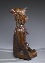 | Keywords: Colima - Seated Male - Walters 20092013 - Right Side.jpg This figure-as-vessel features a seated male of commanding presence The dark red-slipped figure portrays a man with confident visage in a straightforward commanding seated position His hornlike protrusion is tied to his head with embellished embroidered cloth straps and his hip wrap is equally well decorated He also sports an elaborate necklace of large shells The horned element atop the figure's forehead suggests other interpretations particularly that of a shaman and his supernatural horn The shaman would use the horn to battle malevolent spiritual forces the horn also symbolizing his tonally vital essence and spirit power An alternative interpretation views the hornlike element as a symbol of social hierarchy and rulership sacrifice and cosmic geography and the earth's fertility It represents a prong cut from a conch shell that throughout Mesoamerica was associated with rituals of sacrifice and warfare and also expressed political rank As such the figure may be understood as portraying a person of social and political authority based on religious ideology 100 BC-AD 300 Comala Phase earthenware burnished slip paint in red and light brown with incising cm 43 4 29 1 23 2 accession number 2009 20 13 80168 Stendahl Galleries Los Angeles date and mode of acquisition unknown John G Bourne 1990s by purchase Walters Art Museum Gift of John Bourne 2009 place of origin Colima Mexico Walters Art Museum license Objects from Colima in the Walters Art Museum Media contributed by the Walters Art Museum needs category review Jewellery made with sea shells |