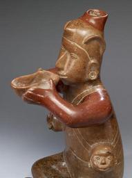 | Keywords: Colima - Seated Male with Trophy Heads - Walters 20092010 - Detail A.jpg This figure-as-vessel features a seated male of commanding presence The sculptor painted the jar's orifice and the man's arms with dark red slip to contrast with the piece's otherwise orange-red coloration The figure's loins are covered by the typical male hip cloth indicated here by incised lines He holds a gourd-shaped bowl to his mouth ready to drink its contents perhaps a chocolate or alcoholic beverage A helmetlike head covering includes an arched element above each ear and a hornlike protrusion at the front The sculpture might portray a warrior implied by the two trophy heads slung across his chest and hanging at his sides The horned element atop the figure's forehead suggests other interpretations particularly that of a shaman and his supernatural horn The shaman would use the horn to battle malevolent spiritual forces the horn also symbolizing his tonally vital essence and spirit power An alternative interpretation views the hornlike element as a symbol of social hierarchy and rulership sacrifice and cosmic geography and the earth's fertility It represents a prong cut from a conch shell that throughout Mesoamerica was associated with rituals of sacrifice and warfare and also expressed political rank As such the figure may be understood as portraying a person of social and political authority based on religious ideology This latter interpretation is supported by the feasting implication of the figure holding the gourd-shaped bowl feasting being an integral part of elite activities throughout the ancient Americas 100 BC-AD 300 Comala Phase earthenware burnished slip paint in red and light brown with incising cm 43 6 25 27 2 accession number 2009 20 10 80165 Michael Robins date and mode of acquisition unknown John G Bourne date and mode of acquisition unknown Walters Art Museum Gift of John Bourne 2009 place of origin Colima Mexico Walters Art Museum license Objects from Colima in the Walters Art Museum Media contributed by the Walters Art Museum needs category review |