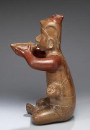 | Keywords: Colima - Seated Male with Trophy Heads - Walters 20092010 - Left Side.jpg This figure-as-vessel features a seated male of commanding presence The sculptor painted the jar's orifice and the man's arms with dark red slip to contrast with the piece's otherwise orange-red coloration The figure's loins are covered by the typical male hip cloth indicated here by incised lines He holds a gourd-shaped bowl to his mouth ready to drink its contents perhaps a chocolate or alcoholic beverage A helmetlike head covering includes an arched element above each ear and a hornlike protrusion at the front The sculpture might portray a warrior implied by the two trophy heads slung across his chest and hanging at his sides The horned element atop the figure's forehead suggests other interpretations particularly that of a shaman and his supernatural horn The shaman would use the horn to battle malevolent spiritual forces the horn also symbolizing his tonally vital essence and spirit power An alternative interpretation views the hornlike element as a symbol of social hierarchy and rulership sacrifice and cosmic geography and the earth's fertility It represents a prong cut from a conch shell that throughout Mesoamerica was associated with rituals of sacrifice and warfare and also expressed political rank As such the figure may be understood as portraying a person of social and political authority based on religious ideology This latter interpretation is supported by the feasting implication of the figure holding the gourd-shaped bowl feasting being an integral part of elite activities throughout the ancient Americas 100 BC-AD 300 Comala Phase earthenware burnished slip paint in red and light brown with incising cm 43 6 25 27 2 accession number 2009 20 10 80165 Michael Robins date and mode of acquisition unknown John G Bourne date and mode of acquisition unknown Walters Art Museum Gift of John Bourne 2009 place of origin Colima Mexico Walters Art Museum license Objects from Colima in the Walters Art Museum Media contributed by the Walters Art Museum needs category review |