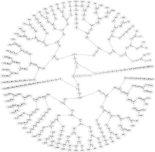 | Keywords: Collatz-graph-20-iterations.svg Graphviz with the help of this Python program <pre> This python script generates a graph that shows 20 levels of the Collatz Conjecture level 1 The root of the tree contains only 1 results This will hold the relationships for the graph Loop 20 times for c in range 20 newlevel set This will be the set of numbers in the level above us for x in level We now loop through each number in our current level There will only sometimes be an odd multiple of 3 plus one above us When x-1 mod 3 is 0 x is an even number half the time So we check against x-4 mod 6 because we don't want to find evens odd x-1 /3 if not x-4 6 else 0 if odd > 1 We don't want 1 the root or 0 no odd found newlevel add odd Put this into the next level resultsodd x Add a relationship to the graph newlevel add x 2 ; There will always be an even number above us resultsx 2 x Add a relationship to the graph Finally advance to the next level level newlevel Technically 1 is odd so 1 3+1 4 If included though this tends to make 2 and 1 overlap on the graph which is ugly Uncomment to include this relationship results1 4; Now we write the graph out to a file in dot format so that graphviz can read it f open 'collatz dot' 'w' For aesthetic reasons we set 8 as the centre node instead of 1 f write 'digraph G \n size 16 16 ;\n root 8;\n splines true;\n' for x in results f write d -> d;\n x resultsx f write ' \n' f close print Generated d nodes len results </pre> en wikipedia Derlay CommonsHelper 2010-03-07 TerrorBite wikipedia en TerrorBite original upload log page en wikipedia Collatz-graph-20-iterations svg 2010-03-07 16 29 TerrorBite 1440×1406× 532396 bytes <nowiki>This is a graph generated in bottom-up fashion of the orbits of all numbers under the Collatz map with an orbit length of 20 or less Created with Graphviz with the help of this Python program This python sc</nowiki> Collatz conjecture |