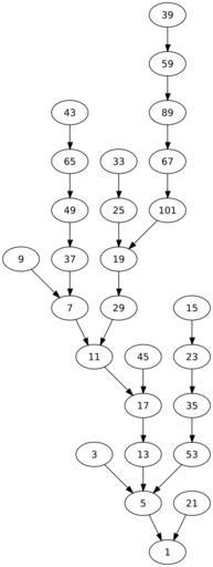 | Keywords: Collatz-graph-50-no27.svg Collatz map For a larger graph see Image Collatz-graph-300 svg Created with Graphviz with the help of this Python program <pre> dotfile file 'collatz-graph dot' 'w' limit 50 def f n while n 2 0 divide by 2 until it's odd n / 2 n 3 n + 1 while n 2 0 n / 2 return n explored set 1 27 31 41 47 dotfile write 'digraph \n' for n in range 3 limit 2 odd numbers while n not in explored dotfile write str n + ' -> ' explored add n n f n dotfile write str n + ';\n' dotfile write ' \n' </pre> en wikipedia Derlay CommonsHelper 2007-06-10 Keenan Pepper wikipedia en Keenan Pepper original upload log page en wikipedia Collatz-graph-50-no27 svg 2007-06-10 20 25 Keenan Pepper 393×1045× 12301 bytes <nowiki>Directed graph showing the orbits of the odd numbers less than 50 with the exceptions of 27 31 41 and 47 because they would make it too tall under the Collatz map Created with Graphviz with the help of </nowiki> Collatz conjecture |