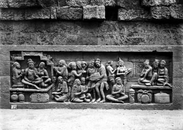 | Keywords: COLLECTIE TROPENMUSEUM Reliëf O 71 op de verborgen voet van de Borobudur TMnr 10015808.jpg nl Negatief Negatief waarop reliëf O 71 van de verborgen voet van de Borobudur te zien is De verborgen voet van de Borobudur is de oorspronkelijke basis van het Buddhistische heiligdom dat rond 800 gebouwd is In een latere fase van de bouw werd deze basis verborgen waarschijnlijk om verzakking te verkomen De vervorgen voet loopt om het hele bouwwerk heen en bevat 160 reliëfs die tezamen de Mahakarmawibhangga verbeelden een Mahayanistische tekst die de werking van de leer van Karma uiteenzet Deze leerrede wordt aan Buddha toegeschreven en handelt over oorzaak en gevolg N J Krom en Th van Erp duiden in hun standaardwerk over de Borobudur Beschrijving van Barabudur Den Haag Martinus Nijhoff 1920-1931 de reliëfs van de verborgen voet aan als serie O Op de reliëfs zijn voorbeelden van de theorie uitgebeeld goede daden hebben goede gevolgen en slechte daden hebben slechte gevolgen De reliëfs vallen in twee delen uiteen O 1 tot en met O 117 verbeelden een aantal daden die leiden tot één en hetzelfde gevolg De reliëfs O 118 tot en met O 160 tonen verschillende gevolgen van één oorzaak De uiteenzetting van de leer begint bij de trap aan de oostzijde en ontrolt zich met de klok mee om het bouwwerk heen De reliëfs moeten dan ook gelezen worden van rechts naar links Lange tijd was onbekend wat op de reliëfs van de verborgen voet stond afgebeeld Hoewel de reliëfs al in 1885 waren ontdekt door Dr Ir J W IJzerman 1851-1932 kon de Franse geleerde Sylvain Lévi pas in 1929 op het zesde Congres van het Oostersch Genootschap constateren dat het op de verborgen voet ging om een Buddhistische tekst Mahakarmawibhangga Lévi had in 1922 een manuscript uit 1411 met deze tekst ontdekt in Kathmandu Nepal De tekst bleek populair in de Burdhistische wereld te zijn en een aantal verwante teksten te hebben twee Chinese werken waarvan één vertaald was in 582 door Gautama Dharmaprajna en één tussen 980 en 1000 door T'ien si Tsai Daarnaast bevat de Tibetaanse Kanjur twee werken met de titel Karmawibhangga In 1933 publiceerde de archeoloog N J Krom een uitgebreide analyse van het Mahakarmawibhangga op de reliëfs van de bedolven voet Hierin legt hij een relatie tussen de afbeeldingen op de reliëfs en de tekstpassages in het Mahakarmawibhangga Reliëf O 71 bevindt zich aan de westzijde van de Borobudur en correspondeert volgens N J Krom met de twaalfde paragraaf van het Mahakarmawibhangga Wat is de daad die een groot bezit ten gevolge heeft Antwoord het afzien van het nemen van wat niet gegeven is; het anderen afhouden van het nemen van wat niet gegeven is; het zich erover verheugen wanneer anderen ervan afzien te nemen wat niet gegeven is; het schenken van levensonderhoud aan vader en moeder; het schenken van levensonderhoud aan edele deugdzame lieden; desgelijks het schenken van levensonderhoud aan anderen zieken kinderen grijsaards en ellendigen; tevredenheid met het voordeel van een ander; ontevredenheid wanneer een ander geen voordeel heeft; het zich zeer verheugen in andermans voordeel; het genoegen scheppen in een goede oogst Zo ook Dat is de daad die een groot bezit ten gevolge heeft Uit N J Krom Het Karmawibhangga op Barabudur Mededeelingen der koninklijke academie van wetenschappen afdeeling letterkunde deel 76 serie B No 8 Amsterdam Noordhollandsche Uitgevers-Maatschappij 1933 231 Deze passage heeft betrekking op de reliëfs O 66 tot en met O 73 Deze reliëfs tonen een aantal personen die getuige zijn van een uitdeling Pp het linkertafereel zijn rijke personen afgebeeld; er staan opgestapelde schatten afgebeeld en de personen bevinden zich in een aanzienlijke omgeving Op deze reliëfs is de goede oogst uit de tekst achterwege gelaten Op reliëf O 71a zijn de zieken uit de tekst bedoeld Bronnen A J Bernet Kempers Borobudur Mysteriegebeuren in steen Verval en restauratie Oudjavaans volksleven Wassenaar 1973/gewijzigde herdruk ; Van Erp Th Krom N J Beschrijving van Barabudur Den Haag Martinus Nijhoff 1920-1931 ; N J Krom Het Karmawibhangga op Barabudur Mededeelingen der koninklijke academie van wetenschappen afdeeling letterkunde deel 76 serie B No 8 Amsterdam Noordhollandsche Uitgevers-Maatschappij 1933 Reliëf O 71 op de verborgen voet van de Borobudur 1890-1891 institution Tropenmuseum KIT-source 10015808 Creator Kassian Cephas KIT-license PD-old-100 Photographs by Kassian Cephas Tropenmuseum Borobudur reliefs Borobudur in 1890 Black and white photographs |