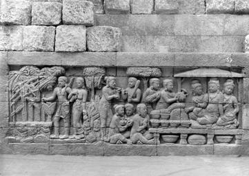 | Keywords: COLLECTIE TROPENMUSEUM Reliëf O 122 op de verborgen voet van de Borobudur TMnr 10015859.jpg nl Negatief Negatief waarop reliëf O 122 van de verborgen voet van de Borobudur te zien is De verborgen voet van de Borobudur is de oorspronkelijke basis van het Buddhistische heiligdom dat rond 800 gebouwd is In een latere fase van de bouw werd deze basis verborgen waarschijnlijk om verzakking te verkomen De verborgen voet loopt om het hele bouwwerk heen en bevat 160 reliëfs die tezamen de Mahakarmawibhangga verbeelden een Mahayanistische tekst die de werking van de leer van Karma uiteenzet Deze leerrede wordt aan Buddha toegeschreven en handelt over oorzaak en gevolg N J Krom en Th van Erp duiden in hun standaardwerk over de Borobudur Beschrijving van Barabudur Den Haag Martinus Nijhoff 1920-1931 de reliëfs van de verborgen voet aan als serie O Op de reliëfs zijn voorbeelden van de theorie uitgebeeld goede daden hebben goede gevolgen en slechte daden hebben slechte gevolgen De reliëfs vallen in twee delen uiteen O 1 tot en met O 117 verbeelden een aantal daden die leiden tot één en hetzelfde gevolg De reliëfs O 118 tot en met O 160 tonen verschillende gevolgen van één oorzaak De uiteenzetting van de leer begint bij de trap aan de oostzijde en ontrolt zich met de klok mee om het bouwwerk heen De reliëfs moeten dan ook gelezen worden van rechts naar links Lange tijd was onbekend wat op de reliëfs van de verborgen voet stond afgebeeld Hoewel de reliëfs al in 1885 waren ontdekt door Dr Ir J W IJzerman 1851-1932 kon de Franse geleerde Sylvain Lévi pas in 1929 op het zesde Congres van het Oostersch Genootschap constateren dat het op de verborgen voet ging om een Buddhistische tekst Mahakarmawibhangga Lévi had in 1922 een manuscript uit 1411 met deze tekst ontdekt in Kathmandu Nepal De tekst bleek populair in de Burdhistische wereld te zijn en een aantal verwante teksten te hebben twee Chinese werken waarvan één vertaald was in 582 door Gautama Dharmaprajna en één tussen 980 en 1000 door T'ien si Tsai Daarnaast bevat de Tibetaanse Kanjur twee werken met de titel Karmawibhangga In 1933 publiceerde de archeoloog N J Krom een uitgebreide analyse van het Mahakarmawibhangga op de reliëfs van de bedolven voet Hierin legt hij een relatie tussen de afbeeldingen op de reliëfs en de tekstpassages in het Mahakarmawibhangga Reliëf O 122 bevindt zich aan de noordzijde van de Borobudur en heeft volgens N J Krom betrekking op paragraaf 61van het Mahakarmawibhangga LXI Door het rijpen van het slechte pad van de daad vals inzicht komen bittere en scherpe vruchten op picumanda kosataki wisatiktalabu enz ; door het rijpen van het slechte pad van de daad van het valse inzicht wordt men aanhanger van het nihilisme en van het inzicht van de vernietiging met de dood en geeft gunst aan de leerboeken van materialisten enz Zoals Boven het rechtertafereel van reliëf O 122 staat de inscriptie 'mitthyadrsti' vals inzicht Te zien is hoe een rijke maaltijd wordt voorgeschoteld aan aanzienlijk man Krom oppert dat deze scène misschien moet aangeven dat het hechten aan wereldse genoegens een verkeerd inzicht is Links op de achtergrond van deze groep staat een brahmaan tegenover een wachter met knots die hem blijkbaar tegenhoudt Volgens Krom zou dit kunnen betekenen dat de vertegenwoordiger van het juiste inzicht verweerd wordt maar het zou ook mogelijk zijn dat een aanhanger van één van de gewraakte leerstukken van de tekst bedoeld is Op het linkertafereel staan een landbouwer en zijn vrouw bij hun land waarvan de scherpe vruchten terug te vinden zijn in de tekst Uit N J Krom Het Karmawibhangga op Barabudur Mededeelingen der koninklijke academie van wetenschappen afdeeling letterkunde deel 76 serie B No 8 Amsterdam Noordhollandsche Uitgevers-Maatschappij 1933 257 Bronnen A J Bernet Kempers Borobudur Mysteriegebeuren in steen Verval en restauratie Oudjavaans volksleven Wassenaar 1973/gewijzigde herdruk ; Van Erp Th Krom N J Beschrijving van Barabudur Den Haag Martinus Nijhoff 1920-1931 ; N J Krom Het Karmawibhangga op Barabudur Mededeelingen der koninklijke academie van wetenschappen afdeeling letterkunde deel 76 serie B No 8 Amsterdam Noordhollandsche Uitgevers-Maatschappij 1933 Reliëf O 122 op de verborgen voet van de Borobudur 1890-1891 institution Tropenmuseum KIT-source 10015859 Creator Kassian Cephas KIT-license PD-old-100 Tropenmuseum Borobudur reliefs Photographs by Kassian Cephas Borobudur in 1890 Black and white photographs |