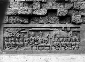 | Keywords: COLLECTIE TROPENMUSEUM Reliëf O 129 op de verborgen voet van de Borobudur TMnr 10015866.jpg nl Negatief Negatief waarop reliëf O 129 van de verborgen voet van de Borobudur te zien is De verborgen voet van de Borobudur is de oorspronkelijke basis van het Buddhistische heiligdom dat rond 800 gebouwd is In een latere fase van de bouw werd deze basis verborgen waarschijnlijk om verzakking te verkomen De verborgen voet loopt om het hele bouwwerk heen en bevat 160 reliëfs die tezamen de Mahakarmawibhangga verbeelden een Mahayanistische tekst die de werking van de leer van Karma uiteenzet Deze leerrede wordt aan Buddha toegeschreven en handelt over oorzaak en gevolg N J Krom en Th van Erp duiden in hun standaardwerk over de Borobudur Beschrijving van Barabudur Den Haag Martinus Nijhoff 1920-1931 de reliëfs van de verborgen voet aan als serie O Op de reliëfs zijn voorbeelden van de theorie uitgebeeld goede daden hebben goede gevolgen en slechte daden hebben slechte gevolgen De reliëfs vallen in twee delen uiteen O 1 tot en met O 117 verbeelden een aantal daden die leiden tot één en hetzelfde gevolg De reliëfs O 118 tot en met O 160 tonen verschillende gevolgen van één oorzaak De uiteenzetting van de leer begint bij de trap aan de oostzijde en ontrolt zich met de klok mee om het bouwwerk heen De reliëfs moeten dan ook gelezen worden van rechts naar links Lange tijd was onbekend wat op de reliëfs van de verborgen voet stond afgebeeld Hoewel de reliëfs al in 1885 waren ontdekt door Dr Ir J W IJzerman 1851-1932 kon de Franse geleerde Sylvain Lévi pas in 1929 op het zesde Congres van het Oostersch Genootschap constateren dat het op de verborgen voet ging om een Buddhistische tekst Mahakarmawibhangga Lévi had in 1922 een manuscript uit 1411 met deze tekst ontdekt in Kathmandu Nepal De tekst bleek populair in de Burdhistische wereld te zijn en een aantal verwante teksten te hebben twee Chinese werken waarvan één vertaald was in 582 door Gautama Dharmaprajna en één tussen 980 en 1000 door T'ien si Tsai Daarnaast bevat de Tibetaanse Kanjur twee werken met de titel Karmawibhangga In 1933 publiceerde de archeoloog N J Krom een uitgebreide analyse van het Mahakarmawibhangga op de reliëfs van de bedolven voet Hierin legt hij een relatie tussen de afbeeldingen op de reliëfs en de tekstpassages in het Mahakarmawibhangga Reliëf O 129 bevindt zich aan de noordzijde van de Borobudur en heeft volgens N J Krom betrekking op paragraaf 64 van het Mahakarmawibhangga LXIV Welke zijn de tien voordelen van de gift van een zonnescherm Antwoord men wordt het zonnescherm van de wereld; men heeft geen branding van het lichaam men heeft geen branding van de geest; alle daden die men doet om tot de heerschappij te raken hebben voorspoed; men wordt herhaaldelijk wereldbeheersende koning; men wordt een groot persoon; men heeft omgang met lieden die grote personen zijn; men heeft omgang met Buddha's en Buddha-hoorders; men heeft een rijke positie; men wordt herboren in de hemels; men bereikt spoedig het Parinirwana Hierbij verhaalt men enz Dit zijn de tien voordelen van de gift van een zonnescherm Deze paragraaf heeft betrekking op vier reliëfs O 127 tot en met O 130 Op reliëf O 127a knielt een man Hij is in het gezelschap van twee vrouwen en bevindt zich voor een zittende brahmaan Op de achtergrond staan twee zonneschermen De inscriptie boven het reliëf luidt chatradana' gift van een zonnescherm Boven O 127b staat de inscriptie nirupataptakayacitta ongebrand van lichaam en geest boven een aanzienlijke man in een paviljoen met zijn gezin en personneel Dit correspondeert met de tekst Het hele reliëf O 128 wordt gevuld door een gesprek van voorname lieden met hun gevolg en vrouwen Boven het reliëf is de inscriptie 'mahesakhyasamawadhana' ontmoeting met grote personen aangebracht Ook O 129 en O 130 tonen maar één tafereel Op O 129 is de wereldheerser te zien met de inscriptie 'cakrawartti'; hij is in het gezelschap van zijn gemalin olifant paard edelsteen en werprad tussen een talrijk gevolg Op O 130 is een hemel afgebeeld; een god met vrouwen dienaren en dienaressen een hemelboom juwelenpotten en kinnara's half mens half vogel Uit N J Krom Het Karmawibhangga op Barabudur Mededeelingen der koninklijke academie van wetenschappen afdeeling letterkunde deel 76 serie B No 8 Amsterdam Noordhollandsche Uitgevers-Maatschappij 1933 260-261 Bronnen A J Bernet Kempers Borobudur Mysteriegebeuren in steen Verval en restauratie Oudjavaans volksleven Wassenaar 1973/gewijzigde herdruk ; Van Erp Th Krom N J Beschrijving van Barabudur Den Haag Martinus Nijhoff 1920-1931 ; N J Krom Het Karmawibhangga op Barabudur Mededeelingen der koninklijke academie van wetenschappen afdeeling letterkunde deel 76 serie B No 8 Amsterdam Noordhollandsche Uitgevers-Maatschappij 1933 Reliëf O 129 op de verborgen voet van de Borobudur 1890-1891 institution Tropenmuseum KIT-source 10015866 Creator Kassian Cephas Borobudur in 1890 Black and white photographs |