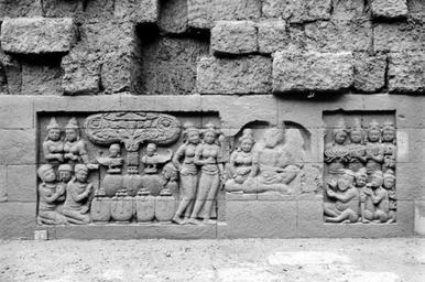 | Keywords: COLLECTIE TROPENMUSEUM Reliëf O 130 op de verborgen voet van de Borobudur TMnr 10015867.jpg nl Negatief Negatief waarop reliëf O 130 van de verborgen voet van de Borobudur te zien is De verborgen voet van de Borobudur is de oorspronkelijke basis van het Buddhistische heiligdom dat rond 800 gebouwd is In een latere fase van de bouw werd deze basis verborgen waarschijnlijk om verzakking te verkomen De verborgen voet loopt om het hele bouwwerk heen en bevat 160 reliëfs die tezamen de Mahakarmawibhangga verbeelden een Mahayanistische tekst die de werking van de leer van Karma uiteenzet Deze leerrede wordt aan Buddha toegeschreven en handelt over oorzaak en gevolg N J Krom en Th van Erp duiden in hun standaardwerk over de Borobudur Beschrijving van Barabudur Den Haag Martinus Nijhoff 1920-1931 de reliëfs van de verborgen voet aan als serie O Op de reliëfs zijn voorbeelden van de theorie uitgebeeld goede daden hebben goede gevolgen en slechte daden hebben slechte gevolgen De reliëfs vallen in twee delen uiteen O 1 tot en met O 117 verbeelden een aantal daden die leiden tot één en hetzelfde gevolg De reliëfs O 118 tot en met O 160 tonen verschillende gevolgen van één oorzaak De uiteenzetting van de leer begint bij de trap aan de oostzijde en ontrolt zich met de klok mee om het bouwwerk heen De reliëfs moeten dan ook gelezen worden van rechts naar links Lange tijd was onbekend wat op de reliëfs van de verborgen voet stond afgebeeld Hoewel de reliëfs al in 1885 waren ontdekt door Dr Ir J W IJzerman 1851-1932 kon de Franse geleerde Sylvain Lévi pas in 1929 op het zesde Congres van het Oostersch Genootschap constateren dat het op de verborgen voet ging om een Buddhistische tekst Mahakarmawibhangga Lévi had in 1922 een manuscript uit 1411 met deze tekst ontdekt in Kathmandu Nepal De tekst bleek populair in de Burdhistische wereld te zijn en een aantal verwante teksten te hebben twee Chinese werken waarvan één vertaald was in 582 door Gautama Dharmaprajna en één tussen 980 en 1000 door T'ien si Tsai Daarnaast bevat de Tibetaanse Kanjur twee werken met de titel Karmawibhangga In 1933 publiceerde de archeoloog N J Krom een uitgebreide analyse van het Mahakarmawibhangga op de reliëfs van de bedolven voet Hierin legt hij een relatie tussen de afbeeldingen op de reliëfs en de tekstpassages in het Mahakarmawibhangga Reliëf O 130 bevindt zich aan de noordzijde van de Borobudur en heeft volgens N J Krom betrekking op paragraaf 64 van het Mahakarmawibhangga LXIV Welke zijn de tien voordelen van de gift van een zonnescherm Antwoord men wordt het zonnescherm van de wereld; men heeft geen branding van het lichaam men heeft geen branding van de geest; alle daden die men doet om tot de heerschappij te raken hebben voorspoed; men wordt herhaaldelijk wereldbeheersende koning; men wordt een groot persoon; men heeft omgang met lieden die grote personen zijn; men heeft omgang met Buddha's en Buddha-hoorders; men heeft een rijke positie; men wordt herboren in de hemels; men bereikt spoedig het Parinirwana Hierbij verhaalt men enz Dit zijn de tien voordelen van de gift van een zonnescherm Deze paragraaf heeft betrekking op vier reliëfs O 127 tot en met O 130 Op reliëf O 127a knielt een man Hij is in het gezelschap van twee vrouwen en bevindt zich voor een zittende brahmaan Op de achtergrond staan twee zonneschermen De inscriptie boven het reliëf luidt chatradana' gift van een zonnescherm Boven O 127b staat de inscriptie nirupataptakayacitta ongebrand van lichaam en geest boven een aanzienlijke man in een paviljoen met zijn gezin en personneel Dit correspondeert met de tekst Het hele reliëf O 128 wordt gevuld door een gesprek van voorname lieden met hun gevolg en vrouwen Boven het reliëf is de inscriptie 'mahesakhyasamawadhana' ontmoeting met grote personen aangebracht Ook O 129 en O 130 tonen maar één tafereel Op O 129 is de wereldheerser te zien met de inscriptie 'cakrawartti'; hij is in het gezelschap van zijn gemalin olifant paard edelsteen en werprad tussen een talrijk gevolg Op O 130 is een hemel afgebeeld; een god met vrouwen dienaren en dienaressen een hemelboom juwelenpotten en kinnara's half mens half vogel Uit N J Krom Het Karmawibhangga op Barabudur Mededeelingen der koninklijke academie van wetenschappen afdeeling letterkunde deel 76 serie B No 8 Amsterdam Noordhollandsche Uitgevers-Maatschappij 1933 260-261 Bronnen A J Bernet Kempers Borobudur Mysteriegebeuren in steen Verval en restauratie Oudjavaans volksleven Wassenaar 1973/gewijzigde herdruk ; Van Erp Th Krom N J Beschrijving van Barabudur Den Haag Martinus Nijhoff 1920-1931 ; N J Krom Het Karmawibhangga op Barabudur Mededeelingen der koninklijke academie van wetenschappen afdeeling letterkunde deel 76 serie B No 8 Amsterdam Noordhollandsche Uitgevers-Maatschappij 1933 Reliëf O 130 op de verborgen voet van de Borobudur 1890-1891 institution Tropenmuseum KIT-source 10015867 Creator Kassian Cephas Borobudur in 1890 Black and white photographs |