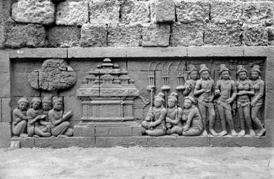 | Keywords: COLLECTIE TROPENMUSEUM Reliëf O 141 op de verborgen voet van de Borobudur TMnr 10015877.jpg nl Negatief Negatief waarop reliëf O 141 van de verborgen voet van de Borobudur te zien is De verborgen voet van de Borobudur is de oorspronkelijke basis van het Buddhistische heiligdom dat rond 800 gebouwd is In een latere fase van de bouw werd deze basis verborgen waarschijnlijk om verzakking te verkomen De verborgen voet loopt om het hele bouwwerk heen en bevat 160 reliëfs die tezamen de Mahakarmawibhangga verbeelden een Mahayanistische tekst die de werking van de leer van Karma uiteenzet Deze leerrede wordt aan Buddha toegeschreven en handelt over oorzaak en gevolg N J Krom en Th van Erp duiden in hun standaardwerk over de Borobudur Beschrijving van Barabudur Den Haag Martinus Nijhoff 1920-1931 de reliëfs van de verborgen voet aan als serie O Op de reliëfs zijn voorbeelden van de theorie uitgebeeld goede daden hebben goede gevolgen en slechte daden hebben slechte gevolgen De reliëfs vallen in twee delen uiteen O 1 tot en met O 117 verbeelden een aantal daden die leiden tot één en hetzelfde gevolg De reliëfs O 118 tot en met O 160 tonen verschillende gevolgen van één oorzaak De uiteenzetting van de leer begint bij de trap aan de oostzijde en ontrolt zich met de klok mee om het bouwwerk heen De reliëfs moeten dan ook gelezen worden van rechts naar links Lange tijd was onbekend wat op de reliëfs van de verborgen voet stond afgebeeld Hoewel de reliëfs al in 1885 waren ontdekt door Dr Ir J W IJzerman kon de Franse geleerde Sylvain Lévi pas in 1929 op het zesde Congres van het Oostersch Genootschap constateren dat het op de verborgen voet ging om een Buddhistische tekst Mahakarmawibhangga Lévi had in 1922 een manuscript uit 1411 met deze tekst ontdekt in Kathmandu Nepal De tekst bleek populair in de Burdhistische wereld te zijn en een aantal verwante teksten te hebben twee Chinese werken waarvan één vertaald was in 582 door Gautama Dharmaprajna en één tussen 980 en 1000 door T'ien si Tsai Daarnaast bevat de Tibetaanse Kanjur twee werken met de titel Karmawibhangga In 1933 publiceerde de archeoloog N J Krom een uitgebreide analyse van het Mahakarmawibhangga op de reliëfs van de bedolven voet Hierin legt hij een relatie tussen de afbeeldingen op de reliëfs en de tekstpassages in het Mahakarmawibhangga Reliëf O 141 bevindt zich aan de oostzijde van de Borobudur en heeft volgens N J Krom betrekking op paragraaf 67 van het Mahakarmawibhangga in de Chinese versie Ch G LXVII Welke zijn de tien voordelen van de gift van een vaandel Antwoord men is een standaard in de wereld en wordt door de koning ministers verwanten vrienden enz vereerd; men is rijk onafhankelijk schatten bezittend; zijn roem wordt naar alle hemelstreken verbreid; men is levenslang schoon van uiterlijk; in volgende incarnaties is men vast en onveranderlijk van gedrag; men heeft grote waardigheid en deugd; men wordt herboren in voorname families; men wordt herboren in de hemels; men bereikt spoedig het Parinirwana Dit zijn de voordelen van de gift van een vaandel Deze paragraaf heeft betrekking op de reliëfs O 141 tot en met O 143 Boven O 141 staat de inscriptie 'pataka' vaandels en zijn voorwerpen afgebeeld die door een groep vereerders aan het heiligdom worden aangeboden Reliëf O 142 is geheel gewijd aan de aanzienlijke rijke man met gevolg en de inscriptie 'adhya-bhogi' zeer gefortuneerd Op O 143 zien we een soortgelijke persoon die een hemelgod voorstelt Er is geen inscriptie maar we zien een hemelboom juwelenpotten en kinnara's half mens half vogel De beeldhouwer heeft zich beperkt tot de steeds terugkerende rijke positie en de hergeboorte in de hemel Uit N J Krom Het Karmawibhangga op Barabudur Mededeelingen der koninklijke academie van wetenschappen afdeeling letterkunde deel 76 serie B No 8 Amsterdam Noordhollandsche Uitgevers-Maatschappij 1933 263-264 Bronnen A J Bernet Kempers Borobudur Mysteriegebeuren in steen Verval en restauratie Oudjavaans volksleven Wassenaar 1973/gewijzigde herdruk ; Van Erp Th Krom N J Beschrijving van Barabudur Den Haag Martinus Nijhoff 1920-1931 ; N J Krom Het Karmawibhangga op Barabudur Mededeelingen der koninklijke academie van wetenschappen afdeeling letterkunde deel 76 serie B No 8 Amsterdam Noordhollandsche Uitgevers-Maatschappij 1933 Reliëf O 141 op de verborgen voet van de Borobudur 1890-1891 institution Tropenmuseum KIT-source 10015877 Creator Kassian Cephas KIT-license PD-old-100 Tropenmuseum Borobudur reliefs Photographs by Kassian Cephas Borobudur in 1890 Black and white photographs |