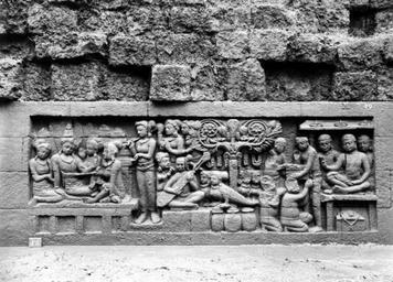 | Keywords: COLLECTIE TROPENMUSEUM Reliëf O 102 op de verborgen voet van de Borobudur TMnr 10015839.jpg nl Negatief Negatief waarop reliëf O 102 van de verborgen voet van de Borobudur te zien is De verborgen voet van de Borobudur is de oorspronkelijke basis van het Buddhistische heiligdom dat rond 800 gebouwd is In een latere fase van de bouw werd deze basis verborgen waarschijnlijk om verzakking te verkomen De verborgen voet loopt om het hele bouwwerk heen en bevat 160 reliëfs die tezamen de Mahakarmawibhangga verbeelden een Mahayanistische tekst die de werking van de leer van Karma uiteenzet Deze leerrede wordt aan Buddha toegeschreven en handelt over oorzaak en gevolg N J Krom en Th van Erp duiden in hun standaardwerk over de Borobudur Beschrijving van Barabudur Den Haag Martinus Nijhoff 1920-1931 de reliëfs van de verborgen voet aan als serie O Op de reliëfs zijn voorbeelden van de theorie uitgebeeld goede daden hebben goede gevolgen en slechte daden hebben slechte gevolgen De reliëfs vallen in twee delen uiteen O 1 tot en met O 117 verbeelden een aantal daden die leiden tot één en hetzelfde gevolg De reliëfs O 118 tot en met O 160 tonen verschillende gevolgen van één oorzaak De uiteenzetting van de leer begint bij de trap aan de oostzijde en ontrolt zich met de klok mee om het bouwwerk heen De reliëfs moeten dan ook gelezen worden van rechts naar links Lange tijd was onbekend wat op de reliëfs van de verborgen voet stond afgebeeld Hoewel de reliëfs al in 1885 waren ontdekt door Dr Ir J W IJzerman 1851-1932 kon de Franse geleerde Sylvain Lévi pas in 1929 op het zesde Congres van het Oostersch Genootschap constateren dat het op de verborgen voet ging om een Buddhistische tekst Mahakarmawibhangga Lévi had in 1922 een manuscript uit 1411 met deze tekst ontdekt in Kathmandu Nepal De tekst bleek populair in de Burdhistische wereld te zijn en een aantal verwante teksten te hebben twee Chinese werken waarvan één vertaald was in 582 door Gautama Dharmaprajna en één tussen 980 en 1000 door T'ien si Tsai Daarnaast bevat de Tibetaanse Kanjur twee werken met de titel Karmawibhangga In 1933 publiceerde de archeoloog N J Krom een uitgebreide analyse van het Mahakarmawibhangga op de reliëfs van de bedolven voet Hierin legt hij een relatie tussen de afbeeldingen op de reliëfs en de tekstpassages in het Mahakarmawibhangga De reliëfs O 101 tot en met O 108 bevinden zich aan de noordzijde van de Borobudur en hebben volgens N J Krom betrekking op de paragrafen twintig tot en met tweeëntwintig van het Mahakarmawibhangga XX Wat is de daad die een geboorte onder de goden van de sfeer der Begeerte ten gevolge heeft Antwoord de tien goede wegen van de daad goed ten einde gebracht Dat is de daad die een geboorte onder de goden van de sfeer der Begeerte ten gevolge heeft XXI Wat is de daad die een geboorte onder de goden van de sfeer van de Vorm ten gevolge heeft Antwoord de tien goede wegen van de daad goed ten einde gebracht goed eigen gemaakt en op de meest voortreffelijke wijze vervolmaakt Dat is de daad die een geboorte onder de goden van de sfeer van de Vorm ten gevolge heeft XXII Wat is de daad die een geboorte onder de goden van de Vormloze sfeer ten gevolge heeft Antwoord de vier instellingen der meditatie van het vormloze de categorie van de oneindigheid van de ruimte de categorie van de oneindigheid van de kennis de categorie van de oneindigheid van het niet de categorie van inzicht en niet-niet-inzicht; deze instellingen van meditatie worden toegepast en vermenigvuldigd Dat is de daad die een geboorte onder de goden van de Vormloze sfeer ten gevolge heeft Op O 101 en O 102 treffen wij hemelvoorstellingen aan Hemelvoorstellingen worden gekarakteriseerd door wensbomen potten vol kostbaarheden onderaan de stam en door twee kinnara's wezens die half mens half vogel zijn Ook op andere plaatsen op het monument worden deze symbolen gebruikt om de hemel voor te stellen Hemeltaferelen worden soms door de inscriptie 'swargga' aangeduid De staande figuren van O 101b en de zittende met aureool op O 102b bevinden zich in een hemel De oorzaak daarvan vinden we op O 101a de aanbieding van een gift aan een brahmaan Op O 102a zien we een predikende monnik en een uitdeling aan behoeftigen Op de linkertaferelen ontbreken de kinnara's en de hemelbomen maar het lijkt Krom niet onwaarschijnlijk dat hier ook een hemel bedoeld is we zien op O 103c naast een paleis of een tempel een persoon in groot ornaat tussen vrouwen die hem dienen De groep op O 104c is voorzien van aureolen O 104 a en op O 104b tonen een predikende monnik en een uitdeling Op 104a is een gift van geschenken afgebeeld aan brahmanen Op 104b zit een mediterende persoon tussen twee onafgewerkte bomen Volgens Krom is het aannemelijk dat de beeldhouwer de hemelboom met kinnara's gereserveerd heeft voor de Kamawacara-goden Hieruit volgt dat O 101 en O 102 bij paragraaf XX horen en de hemels van O 103 en O 104 bij de goden van Rupawacara van XXI De grote moeilijkheid komt dan bij de goden van Arupyawacara van XXII want het lijkt Krom uitgesloten dat deze wezens weergegeven kunnen worden in een vorm; men mag ze zelfs helemaal niet verwachten op reliëfs Maar Krom meent dat op O 105 een poging is gedaan om aan te geven om de staat van vormeloosheid te bereiken; de vier monniken die ieder in een afzonderlijke rotsnis zitten te mediteren zouden de vier samapatti's van de tekst vertegenwoordigen Op reliëf O 106 is de hoofdpersoon in groot ornaat afgebeeld met een aureool achter het hoofd Achter zijn dienaren staat op het midden van het reliëf een boom; niet de gestileerde hemelboom maar wel met de juwelenpotten aan de voet O 106a geeft een huldebetuiging weer onder andere met een tros bananen van een aantal monniken De hoofdpersoon van O 107b heeft geen aureool maar draagt wel groot ornaat Ook hier staan juwelenpotten O 107a toont een uitdeling van onder meer kleding Reliëf O 108 begint met het geven van geschenken door rijk geklede perso