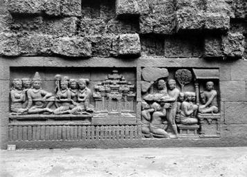 | Keywords: COLLECTIE TROPENMUSEUM Reliëf O 103 op de verborgen voet van de Borobudur TMnr 10015840.jpg nl Negatief Negatief waarop reliëf O 103 van de verborgen voet van de Borobudur te zien is De verborgen voet van de Borobudur is de oorspronkelijke basis van het Buddhistische heiligdom dat rond 800 gebouwd is In een latere fase van de bouw werd deze basis verborgen waarschijnlijk om verzakking te verkomen De verborgen voet loopt om het hele bouwwerk heen en bevat 160 reliëfs die tezamen de Mahakarmawibhangga verbeelden een Mahayanistische tekst die de werking van de leer van Karma uiteenzet Deze leerrede wordt aan Buddha toegeschreven en handelt over oorzaak en gevolg N J Krom en Th van Erp duiden in hun standaardwerk over de Borobudur Beschrijving van Barabudur Den Haag Martinus Nijhoff 1920-1931 de reliëfs van de verborgen voet aan als serie O Op de reliëfs zijn voorbeelden van de theorie uitgebeeld goede daden hebben goede gevolgen en slechte daden hebben slechte gevolgen De reliëfs vallen in twee delen uiteen O 1 tot en met O 117 verbeelden een aantal daden die leiden tot één en hetzelfde gevolg De reliëfs O 118 tot en met O 160 tonen verschillende gevolgen van één oorzaak De uiteenzetting van de leer begint bij de trap aan de oostzijde en ontrolt zich met de klok mee om het bouwwerk heen De reliëfs moeten dan ook gelezen worden van rechts naar links Lange tijd was onbekend wat op de reliëfs van de verborgen voet stond afgebeeld Hoewel de reliëfs al in 1885 waren ontdekt door Dr Ir J W IJzerman 1851-1932 kon de Franse geleerde Sylvain Lévi pas in 1929 op het zesde Congres van het Oostersch Genootschap constateren dat het op de verborgen voet ging om een Buddhistische tekst Mahakarmawibhangga Lévi had in 1922 een manuscript uit 1411 met deze tekst ontdekt in Kathmandu Nepal De tekst bleek populair in de Burdhistische wereld te zijn en een aantal verwante teksten te hebben twee Chinese werken waarvan één vertaald was in 582 door Gautama Dharmaprajna en één tussen 980 en 1000 door T'ien si Tsai Daarnaast bevat de Tibetaanse Kanjur twee werken met de titel Karmawibhangga In 1933 publiceerde de archeoloog N J Krom een uitgebreide analyse van het Mahakarmawibhangga op de reliëfs van de bedolven voet Hierin legt hij een relatie tussen de afbeeldingen op de reliëfs en de tekstpassages in het Mahakarmawibhangga De reliëfs O 101 tot en met O 108 bevinden zich aan de noordzijde van de Borobudur en hebben volgens N J Krom betrekking op de paragrafen twintig tot en met tweeëntwintig van het Mahakarmawibhangga XX Wat is de daad die een geboorte onder de goden van de sfeer der Begeerte ten gevolge heeft Antwoord de tien goede wegen van de daad goed ten einde gebracht Dat is de daad die een geboorte onder de goden van de sfeer der Begeerte ten gevolge heeft XXI Wat is de daad die een geboorte onder de goden van de sfeer van de Vorm ten gevolge heeft Antwoord de tien goede wegen van de daad goed ten einde gebracht goed eigen gemaakt en op de meest voortreffelijke wijze vervolmaakt Dat is de daad die een geboorte onder de goden van de sfeer van de Vorm ten gevolge heeft XXII Wat is de daad die een geboorte onder de goden van de Vormloze sfeer ten gevolge heeft Antwoord de vier instellingen der meditatie van het vormloze de categorie van de oneindigheid van de ruimte de categorie van de oneindigheid van de kennis de categorie van de oneindigheid van het niet de categorie van inzicht en niet-niet-inzicht; deze instellingen van meditatie worden toegepast en vermenigvuldigd Dat is de daad die een geboorte onder de goden van de Vormloze sfeer ten gevolge heeft Op O 101 en O 102 treffen wij hemelvoorstellingen aan Hemelvoorstellingen worden gekarakteriseerd door wensbomen potten vol kostbaarheden onderaan de stam en door twee kinnara's wezens die half mens half vogel zijn Ook op andere plaatsen op het monument worden deze symbolen gebruikt om de hemel voor te stellen Hemeltaferelen worden soms door de inscriptie 'swargga' aangeduid De staande figuren van O 101b en de zittende met aureool op O 102b bevinden zich in een hemel De oorzaak daarvan vinden we op O 101a de aanbieding van een gift aan een brahmaan Op O 102a zien we een predikende monnik en een uitdeling aan behoeftigen Op de linkertaferelen ontbreken de kinnara's en de hemelbomen maar het lijkt Krom niet onwaarschijnlijk dat hier ook een hemel bedoeld is we zien op O 103c naast een paleis of een tempel een persoon in groot ornaat tussen vrouwen die hem dienen De groep op O 104c is voorzien van aureolen O 104 a en op O 104b tonen een predikende monnik en een uitdeling Op 104a is een gift van geschenken afgebeeld aan brahmanen Op 104b zit een mediterende persoon tussen twee onafgewerkte bomen Volgens Krom is het aannemelijk dat de beeldhouwer de hemelboom met kinnara's gereserveerd heeft voor de Kamawacara-goden Hieruit volgt dat O 101 en O 102 bij paragraaf XX horen en de hemels van O 103 en O 104 bij de goden van Rupawacara van XXI De grote moeilijkheid komt dan bij de goden van Arupyawacara van XXII want het lijkt Krom uitgesloten dat deze wezens weergegeven kunnen worden in een vorm; men mag ze zelfs helemaal niet verwachten op reliëfs Maar Krom meent dat op O 105 een poging is gedaan om aan te geven om de staat van vormeloosheid te bereiken; de vier monniken die ieder in een afzonderlijke rotsnis zitten te mediteren zouden de vier samapatti's van de tekst vertegenwoordigen Op reliëf O 106 is de hoofdpersoon in groot ornaat afgebeeld met een aureool achter het hoofd Achter zijn dienaren staat op het midden van het reliëf een boom; niet de gestileerde hemelboom maar wel met de juwelenpotten aan de voet O 106a geeft een huldebetuiging weer onder andere met een tros bananen van een aantal monniken De hoofdpersoon van O 107b heeft geen aureool maar draagt wel groot ornaat Ook hier staan juwelenpotten O 107a toont een uitdeling van onder meer kleding Reliëf O 108 begint met het geven van geschenken door rijk geklede perso