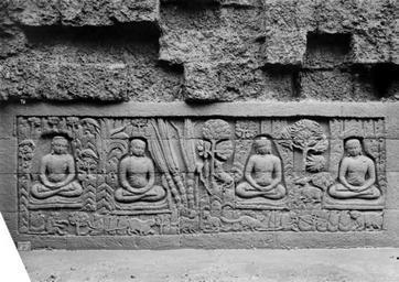 | Keywords: COLLECTIE TROPENMUSEUM Reliëf O 105 op de verborgen voet van de Borobudur TMnr 10015842.jpg nl Negatief Negatief waarop reliëf O 105 van de verborgen voet van de Borobudur te zien is De verborgen voet van de Borobudur is de oorspronkelijke basis van het Buddhistische heiligdom dat rond 800 gebouwd is In een latere fase van de bouw werd deze basis verborgen waarschijnlijk om verzakking te verkomen De verborgen voet loopt om het hele bouwwerk heen en bevat 160 reliëfs die tezamen de Mahakarmawibhangga verbeelden een Mahayanistische tekst die de werking van de leer van Karma uiteenzet Deze leerrede wordt aan Buddha toegeschreven en handelt over oorzaak en gevolg N J Krom en Th van Erp duiden in hun standaardwerk over de Borobudur Beschrijving van Barabudur Den Haag Martinus Nijhoff 1920-1931 de reliëfs van de verborgen voet aan als serie O Op de reliëfs zijn voorbeelden van de theorie uitgebeeld goede daden hebben goede gevolgen en slechte daden hebben slechte gevolgen De reliëfs vallen in twee delen uiteen O 1 tot en met O 117 verbeelden een aantal daden die leiden tot één en hetzelfde gevolg De reliëfs O 118 tot en met O 160 tonen verschillende gevolgen van één oorzaak De uiteenzetting van de leer begint bij de trap aan de oostzijde en ontrolt zich met de klok mee om het bouwwerk heen De reliëfs moeten dan ook gelezen worden van rechts naar links Lange tijd was onbekend wat op de reliëfs van de verborgen voet stond afgebeeld Hoewel de reliëfs al in 1885 waren ontdekt door Dr Ir J W IJzerman 1851-1932 kon de Franse geleerde Sylvain Lévi pas in 1929 op het zesde Congres van het Oostersch Genootschap constateren dat het op de verborgen voet ging om een Buddhistische tekst Mahakarmawibhangga Lévi had in 1922 een manuscript uit 1411 met deze tekst ontdekt in Kathmandu Nepal De tekst bleek populair in de Burdhistische wereld te zijn en een aantal verwante teksten te hebben twee Chinese werken waarvan één vertaald was in 582 door Gautama Dharmaprajna en één tussen 980 en 1000 door T'ien si Tsai Daarnaast bevat de Tibetaanse Kanjur twee werken met de titel Karmawibhangga In 1933 publiceerde de archeoloog N J Krom een uitgebreide analyse van het Mahakarmawibhangga op de reliëfs van de bedolven voet Hierin legt hij een relatie tussen de afbeeldingen op de reliëfs en de tekstpassages in het Mahakarmawibhangga De reliëfs O 101 tot en met O 108 bevinden zich aan de noordzijde van de Borobudur en hebben volgens N J Krom betrekking op de paragrafen twintig tot en met tweeëntwintig van het Mahakarmawibhangga XX Wat is de daad die een geboorte onder de goden van de sfeer der Begeerte ten gevolge heeft Antwoord de tien goede wegen van de daad goed ten einde gebracht Dat is de daad die een geboorte onder de goden van de sfeer der Begeerte ten gevolge heeft XXI Wat is de daad die een geboorte onder de goden van de sfeer van de Vorm ten gevolge heeft Antwoord de tien goede wegen van de daad goed ten einde gebracht goed eigen gemaakt en op de meest voortreffelijke wijze vervolmaakt Dat is de daad die een geboorte onder de goden van de sfeer van de Vorm ten gevolge heeft XXII Wat is de daad die een geboorte onder de goden van de Vormloze sfeer ten gevolge heeft Antwoord de vier instellingen der meditatie van het vormloze de categorie van de oneindigheid van de ruimte de categorie van de oneindigheid van de kennis de categorie van de oneindigheid van het niet de categorie van inzicht en niet-niet-inzicht; deze instellingen van meditatie worden toegepast en vermenigvuldigd Dat is de daad die een geboorte onder de goden van de Vormloze sfeer ten gevolge heeft Op O 101 en O 102 treffen wij hemelvoorstellingen aan Hemelvoorstellingen worden gekarakteriseerd door wensbomen potten vol kostbaarheden onderaan de stam en door twee kinnara's wezens die half mens half vogel zijn Ook op andere plaatsen op het monument worden deze symbolen gebruikt om de hemel voor te stellen Hemeltaferelen worden soms door de inscriptie 'swargga' aangeduid De staande figuren van O 101b en de zittende met aureool op O 102b bevinden zich in een hemel De oorzaak daarvan vinden we op O 101a de aanbieding van een gift aan een brahmaan Op O 102a zien we een predikende monnik en een uitdeling aan behoeftigen Op de linkertaferelen ontbreken de kinnara's en de hemelbomen maar het lijkt Krom niet onwaarschijnlijk dat hier ook een hemel bedoeld is we zien op O 103c naast een paleis of een tempel een persoon in groot ornaat tussen vrouwen die hem dienen De groep op O 104c is voorzien van aureolen O 104 a en op O 104b tonen een predikende monnik en een uitdeling Op 104a is een gift van geschenken afgebeeld aan brahmanen Op 104b zit een mediterende persoon tussen twee onafgewerkte bomen Volgens Krom is het aannemelijk dat de beeldhouwer de hemelboom met kinnara's gereserveerd heeft voor de Kamawacara-goden Hieruit volgt dat O 101 en O 102 bij paragraaf XX horen en de hemels van O 103 en O 104 bij de goden van Rupawacara van XXI De grote moeilijkheid komt dan bij de goden van Arupyawacara van XXII want het lijkt Krom uitgesloten dat deze wezens weergegeven kunnen worden in een vorm; men mag ze zelfs helemaal niet verwachten op reliëfs Maar Krom meent dat op O 105 een poging is gedaan om aan te geven om de staat van vormeloosheid te bereiken; de vier monniken die ieder in een afzonderlijke rotsnis zitten te mediteren zouden de vier samapatti's van de tekst vertegenwoordigen Op reliëf O 106 is de hoofdpersoon in groot ornaat afgebeeld met een aureool achter het hoofd Achter zijn dienaren staat op het midden van het reliëf een boom; niet de gestileerde hemelboom maar wel met de juwelenpotten aan de voet O 106a geeft een huldebetuiging weer onder andere met een tros bananen van een aantal monniken De hoofdpersoon van O 107b heeft geen aureool maar draagt wel groot ornaat Ook hier staan juwelenpotten O 107a toont een uitdeling van onder meer kleding Reliëf O 108 begint met het geven van geschenken door rijk geklede perso