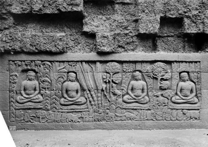 Keywords: COLLECTIE TROPENMUSEUM Reliëf O 105 op de verborgen voet van de Borobudur TMnr 10015842.jpg nl Negatief Negatief waarop reliëf O 105 van de verborgen voet van de Borobudur te zien is De verborgen voet van de Borobudur is de oorspronkelijke basis van het Buddhistische heiligdom dat rond 800 gebouwd is In een latere fase van de bouw werd deze basis verborgen waarschijnlijk om verzakking te verkomen De verborgen voet loopt om het hele bouwwerk heen en bevat 160 reliëfs die tezamen de Mahakarmawibhangga verbeelden een Mahayanistische tekst die de werking van de leer van Karma uiteenzet Deze leerrede wordt aan Buddha toegeschreven en handelt over oorzaak en gevolg N J Krom en Th van Erp duiden in hun standaardwerk over de Borobudur Beschrijving van Barabudur Den Haag Martinus Nijhoff 1920-1931 de reliëfs van de verborgen voet aan als serie O Op de reliëfs zijn voorbeelden van de theorie uitgebeeld goede daden hebben goede gevolgen en slechte daden hebben slechte gevolgen De reliëfs vallen in twee delen uiteen O 1 tot en met O 117 verbeelden een aantal daden die leiden tot één en hetzelfde gevolg De reliëfs O 118 tot en met O 160 tonen verschillende gevolgen van één oorzaak De uiteenzetting van de leer begint bij de trap aan de oostzijde en ontrolt zich met de klok mee om het bouwwerk heen De reliëfs moeten dan ook gelezen worden van rechts naar links Lange tijd was onbekend wat op de reliëfs van de verborgen voet stond afgebeeld Hoewel de reliëfs al in 1885 waren ontdekt door Dr Ir J W IJzerman 1851-1932 kon de Franse geleerde Sylvain Lévi pas in 1929 op het zesde Congres van het Oostersch Genootschap constateren dat het op de verborgen voet ging om een Buddhistische tekst Mahakarmawibhangga Lévi had in 1922 een manuscript uit 1411 met deze tekst ontdekt in Kathmandu Nepal De tekst bleek populair in de Burdhistische wereld te zijn en een aantal verwante teksten te hebben twee Chinese werken waarvan één vertaald was in 582 door Gautama Dharmaprajna en één tussen 980 en 1000 door T'ien si Tsai Daarnaast bevat de Tibetaanse Kanjur twee werken met de titel Karmawibhangga In 1933 publiceerde de archeoloog N J Krom een uitgebreide analyse van het Mahakarmawibhangga op de reliëfs van de bedolven voet Hierin legt hij een relatie tussen de afbeeldingen op de reliëfs en de tekstpassages in het Mahakarmawibhangga De reliëfs O 101 tot en met O 108 bevinden zich aan de noordzijde van de Borobudur en hebben volgens N J Krom betrekking op de paragrafen twintig tot en met tweeëntwintig van het Mahakarmawibhangga XX Wat is de daad die een geboorte onder de goden van de sfeer der Begeerte ten gevolge heeft Antwoord de tien goede wegen van de daad goed ten einde gebracht Dat is de daad die een geboorte onder de goden van de sfeer der Begeerte ten gevolge heeft XXI Wat is de daad die een geboorte onder de goden van de sfeer van de Vorm ten gevolge heeft Antwoord de tien goede wegen van de daad goed ten einde gebracht goed eigen gemaakt en op de meest voortreffelijke wijze vervolmaakt Dat is de daad die een geboorte onder de goden van de sfeer van de Vorm ten gevolge heeft XXII Wat is de daad die een geboorte onder de goden van de Vormloze sfeer ten gevolge heeft Antwoord de vier instellingen der meditatie van het vormloze de categorie van de oneindigheid van de ruimte de categorie van de oneindigheid van de kennis de categorie van de oneindigheid van het niet de categorie van inzicht en niet-niet-inzicht; deze instellingen van meditatie worden toegepast en vermenigvuldigd Dat is de daad die een geboorte onder de goden van de Vormloze sfeer ten gevolge heeft Op O 101 en O 102 treffen wij hemelvoorstellingen aan Hemelvoorstellingen worden gekarakteriseerd door wensbomen potten vol kostbaarheden onderaan de stam en door twee kinnara's wezens die half mens half vogel zijn Ook op andere plaatsen op het monument worden deze symbolen gebruikt om de hemel voor te stellen Hemeltaferelen worden soms door de inscriptie 'swargga' aangeduid De staande figuren van O 101b en de zittende met aureool op O 102b bevinden zich in een hemel De oorzaak daarvan vinden we op O 101a de aanbieding van een gift aan een brahmaan Op O 102a zien we een predikende monnik en een uitdeling aan behoeftigen Op de linkertaferelen ontbreken de kinnara's en de hemelbomen maar het lijkt Krom niet onwaarschijnlijk dat hier ook een hemel bedoeld is we zien op O 103c naast een paleis of een tempel een persoon in groot ornaat tussen vrouwen die hem dienen De groep op O 104c is voorzien van aureolen O 104 a en op O 104b tonen een predikende monnik en een uitdeling Op 104a is een gift van geschenken afgebeeld aan brahmanen Op 104b zit een mediterende persoon tussen twee onafgewerkte bomen Volgens Krom is het aannemelijk dat de beeldhouwer de hemelboom met kinnara's gereserveerd heeft voor de Kamawacara-goden Hieruit volgt dat O 101 en O 102 bij paragraaf XX horen en de hemels van O 103 en O 104 bij de goden van Rupawacara van XXI De grote moeilijkheid komt dan bij de goden van Arupyawacara van XXII want het lijkt Krom uitgesloten dat deze wezens weergegeven kunnen worden in een vorm; men mag ze zelfs helemaal niet verwachten op reliëfs Maar Krom meent dat op O 105 een poging is gedaan om aan te geven om de staat van vormeloosheid te bereiken; de vier monniken die ieder in een afzonderlijke rotsnis zitten te mediteren zouden de vier samapatti's van de tekst vertegenwoordigen Op reliëf O 106 is de hoofdpersoon in groot ornaat afgebeeld met een aureool achter het hoofd Achter zijn dienaren staat op het midden van het reliëf een boom; niet de gestileerde hemelboom maar wel met de juwelenpotten aan de voet O 106a geeft een huldebetuiging weer onder andere met een tros bananen van een aantal monniken De hoofdpersoon van O 107b heeft geen aureool maar draagt wel groot ornaat Ook hier staan juwelenpotten O 107a toont een uitdeling van onder meer kleding Reliëf O 108 begint met het geven van geschenken door rijk geklede persone