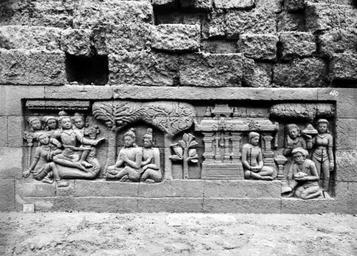 | Keywords: COLLECTIE TROPENMUSEUM Reliëf O 31 op de verborgen voet van de Borobudur TMnr 10015769.jpg nl Negatief Negatief waarop reliëf O 31 van de verborgen voet van de Borobudur te zien is De verborgen voet van de Borobudur is de oorspronkelijke basis van het Buddhistische heiligdom dat rond 800 gebouwd is In een latere fase van de bouw werd deze basis verborgen waarschijnlijk om verzakking te verkomen De verborgen voet loopt om het hele bouwwerk heen en bevat 160 reliëfs die tezamen de Mahakarmawibhangga verbeelden een Mahayanistische tekst die de werking van de leer van Karma uiteenzet Deze leerrede wordt aan Buddha toegeschreven en handelt over oorzaak en gevolg N J Krom en Th van Erp duiden in hun standaardwerk over de Borobudur Beschrijving van Barabudur Den Haag Martinus Nijhoff 1920-1931 de reliëfs van de verborgen voet aan als serie O Op de reliëfs zijn voorbeelden van de theorie uitgebeeld goede daden hebben goede gevolgen en slechte daden hebben slechte gevolgen De reliëfs vallen in twee delen uiteen O 1 tot en met O 117 verbeelden een aantal daden die leiden tot één en hetzelfde gevolg De reliëfs O 118 tot en met O 160 tonen verschillende gevolgen van één oorzaak De uiteenzetting van de leer begint bij de trap aan de oostzijde en ontrolt zich met de klok mee om het bouwwerk heen De reliëfs moeten dan ook gelezen worden van rechts naar links Lange tijd was onbekend wat op de reliëfs van de verborgen voet stond afgebeeld Hoewel de reliëfs al in 1885 waren ontdekt door Dr Ir J W IJzerman 1851-1932 kon de Franse geleerde Sylvain Lévi pas in 1929 op het zesde Congres van het Oostersch Genootschap constateren dat het op de verborgen voet ging om een Buddhistische tekst Mahakarmawibhangga Lévi had in 1922 een manuscript uit 1411 met deze tekst ontdekt in Kathmandu Nepal De tekst bleek populair in de Burdhistische wereld te zijn en een aantal verwante teksten te hebben twee Chinese werken waarvan één vertaald was in 582 door Gautama Dharmaprajna en één tussen 980 en 1000 door T'ien si Tsai Daarnaast bevat de Tibetaanse Kanjur twee werken met de titel Karmawibhangga In 1933 publiceerde de archeoloog N J Krom een uitgebreide analyse van het Mahakarmawibhangga op de reliëfs van de bedolven voet Hierin legt hij een relatie tussen de afbeeldingen op de reliëfs en de tekstpassages in het Mahakarmawibhangga Reliëf O 31 bevindt zich aan de zuidzijde van de Borobudur en correspondeert volgens N J Krom met de zesde paragraaf van het Mahakarmawibhangga Wat is de daad die bevalligheid ten gevolge heeft Antwoord afwezigheid van toorn; afwezigheid van haatdragendheid; afwezigheid van geveinsdheid; het schenken van kleden; het geven van stuco voor stupa's en caitya-monumenten; het geven van gouden vaatwerk het geven van welriekende pleister; het geven van versierselen; het prijzen van vader en moeder; het prijzen van edele deugdzame lieden; het schoonvegen van stupahoven en kloosters; het voortdurend schoonvegen van caitya- monumenten; het niet uitlachen van wanstaltige wezens en ook van anderen kinderen en grijsaards; desgelijks een behoorlijk gedrag Zoals Dat is de daad die bevalligheid ten gevolge heeft Uit N J Krom Het Karmawibhangga op Barabudur Mededeelingen der koninklijke academie van wetenschappen afdeeling letterkunde deel 76 serie B No 8 Amsterdam Noordhollandsche Uitgevers-Maatschappij 1933 223 Deze paragraaf heeft betrekking op reliëfs O 26 tot en met O 33 Op de linkertaferelen is gratie bevalligheid uitgebeeld door middel van een aanzienlijke man met zijn gezin en personeel; het gevolg van hetgeen op het rechtergedeelte is te zien De reliëfs O 29 tot en met O 31 tonen hulde aan heiligdommen waarbij de beeldhouwer niet het schoonvegen en de stupa volgt maar wel drie soorten gebouwen afbeeldt Reliëf 31a toont een huldebetuiging aan een monument; in de deur zit een monnik Bronnen A J Bernet Kempers Borobudur Mysteriegebeuren in steen Verval en restauratie Oudjavaans volksleven Wassenaar 1973/gewijzigde herdruk ; Van Erp Th Krom N J Beschrijving van Barabudur Den Haag Martinus Nijhoff 1920-1931 ; N J Krom Het Karmawibhangga op Barabudur Mededeelingen der koninklijke academie van wetenschappen afdeeling letterkunde deel 76 serie B No 8 Amsterdam Noordhollandsche Uitgevers-Maatschappij 1933 Reliëf O 31 op de verborgen voet van de Borobudur 1890-1891 institution Tropenmuseum KIT-source 10015769 Creator Kassian Cephas KIT-license PD-old-100 Photographs by Kassian Cephas Tropenmuseum Borobudur reliefs Borobudur in 1890 Black and white photographs |