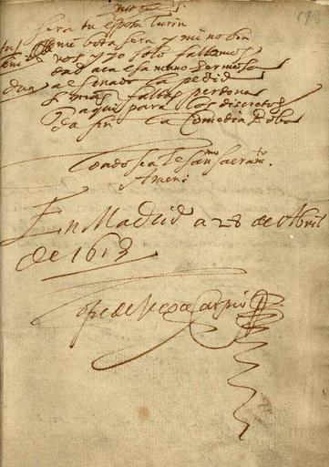 | Keywords: Colofón de La dama boba (autógrafo).jpg es Colofón de La dama boba comedia Inc Que lindas posadas Exp da fin la comedia boba Fechada y firmada al final En Madrid a 28 de abril / de 1613 / Lope de Vega Carpio <br><br>Leyenda <br> será tu esposa Turín <br> TURÍN Mi bota será y mi novia <br> FENISO Vos y yo sólo faltamos;<br> dad acá esa mano hermosa <br> DUARDO Al senado la pedid <br> si nuestras faltas perdona;<br> que aquí para los discretos <br> da fin la comedia boba <br><br> Loado sea el Santísimo Sacramento<br> Amén<br> En Madrid a 28 de abril<br> de 1613<br><br> Lope de Vega Carpio rúbrica http //bibliotecadigitalhispanica bne es/webclient/DeliveryManager pid 198696 custom_att_2 simple_viewer Lope de Vega 1613-04-28 Portada 100px La dama boba 1613 documents PD-old-100 |
