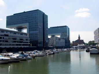 Keywords: cologne crane homes architecture building facade modern home glass window modern architecture rhine river glass rhine river port harbour area rhine harbor