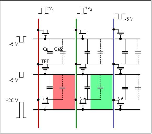 | Keywords: Color TFT-LCD Cells-Schematic.png Schéma électrique équivalent des cellules TFT d'un écran à cristaux liquides TFT-LCD où la pixel inférieur est allumé en jaune / Equivalent electric schematic of a TFT array in a LCD display A yellow pixel is lit by polarising R and B sub-pixels of the bottom pixel Les lignes horizontales commandes les grilles des transistors à effet de champ; les lignes verticales pilotent les sources / Horizontal lines drive the gates of the field-effect transistors FET while vertical ones command gray level through the sources Cs Capacité de stockage du sous-pixel / subpixel storage capacitance Cgs Capacité parasite entre l'électrode du sous-pixel et l'électrode avant / parasitic capacitance between cell electrode and front electrode Comments are welcome Image talk Color TFT-LCD Cells-Schematic png Commentaires bienvenus 2005-12-05 own assumed Lozère schematic drawings of LCDs TFT circuits |