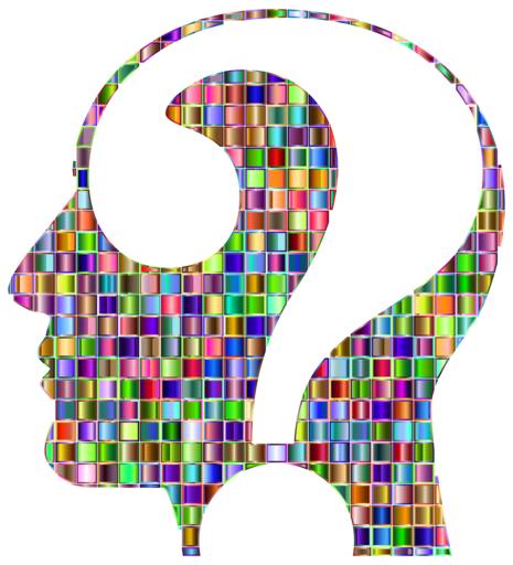 Keywords: colorful prismatic chromatic rainbow squares mosaic checkered abstract geometric art human head man male cranium profile question mark thought think contemplate analyze unknown
