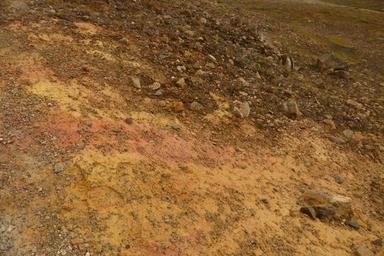 | Keywords: valley of ten thousand smokes valleyoftenthousandsmokes texture outdoor soil The Valley is covered with mineral deposits that mark the location of extinct fumaroles. Black staining around these spots typically reflect magnetite or hematite. White zones may be enriched in silica and clay minerals. Orange to yellow staining indicates minerals such as limonite, geothite, or sulfur.NPS photo by M. Fitz. The Valley is covered with mineral deposits that mark the location of extinct fumaroles. Black staining around these spots typically reflect magnetite or hematite. White zones may be enriched in silica and clay minerals. Orange to yellow staining indicates minerals such as limonite, geothite, or sulfur.NPS photo by M. Fitz. |