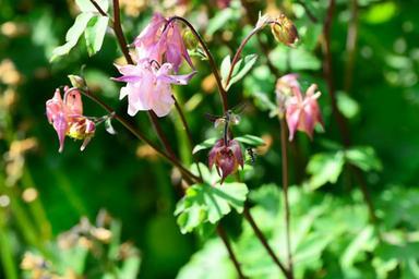 Keywords: columbine aquilegia cottage garden delicate pink floating flimsy wild pure insect hover fly close-up detail