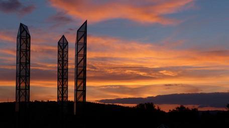 Keywords: columnar steles glass columns art artwork modern art sunset afterglow sky clouds uni irchel zurich switzerland university of irchel