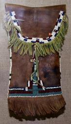 | Keywords: Comanche ration bag 1880 OHS.jpg en Comanche beaded ration bag Oklahoma ca 1880 collect of the Oklahoma History Center During the Reservation Era Comanche and other Southern Plains women would beaded decorative pouches for their ration cards utilizing scrap harness or boot leather own Uyvsdi 2009-08 Comanche Native American beaded bags and pouches Rationing |