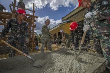 | Keywords: Combined Philippine-US force continues humanitarian efforts in Panay 150409-N-HA376-274.jpg en Armed Forces of the Philippines engineers from the 552nd Engineer Construction Battalion U S Navy Seabees assigned to Naval Mobile Construction Battalion 5 and U S Marine engineers from the 9th Engineer Support Battalion move concrete for placement at Don Joaquin Elementary School in Tapaz Philippines during Balikatan 2015 April 9 The engineers part of the Combined-Joint Civil-Military Operations Task Force on the island of Panay are constructing two classrooms at the school Balikatan which means shoulder to shoulder in Filipino is an annual bilateral training exercise aimed at improving the ability of Philippine and U S military forces to work together during planning contingency humanitarian assistance and disaster relief operations U S Navy photo by Chief Mass Communication Specialist Lowell Whitman/Released 2015-04-09 Chief Petty Officer Lowell Whitman https //www dvidshub net/image/1868999 150409-N-HA376-274 2015-04-12 05 48 TAPAZ PH PD-USGov-Military-Navy Balikatan 2015 United States Navy Seabees Images from DoD uploaded by Fæ |