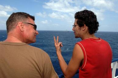 | Keywords: Combined Task Force 151 - 090207-N-3931M-232.jpg en 090207-N-3931M-232 OFF THE COAST OF SOMALIA Feb 7 2009 “ The guided missile destroyer USS Mason DDG-87 can be seen in the distance as Lt Cmdr Brian Weigelt a chaplain from the ship talks with a crew member from Motor Vessel Faina Somali pirates released Faina Feb 5 after holding the ship hostage for more than four months at an anchorage off the Somali coast The Belize-flagged cargo ship is owned and operated by Kaalbye Shipping Ukraine and is carrying a cargo of Ukrainian T-72 tanks and related equipment U S Navy photo by Mass Communication Specialist 1st Class Michael R McCormick/Released http //www news navy mil/view_single asp id 68696 Mass Communication Specialist 1st Class Michael R McCormick USN 2009-02-07 PD-USGov-Military-Navy Combined Task Force 151 Faina ship 1978 USS Mason DDG-87 United States Navy chaplains |