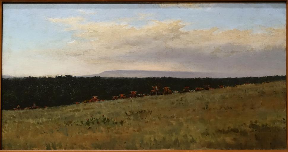 | Keywords: Coming Herd, After a Rain, by Frank Reaugh, c. 1895, oil on canvas - Harry Ransom Center - University of Texas at Austin - DSC08548.jpg en Exhibit in the Harry Ransom Center - University of Texas at Austin Austin Texas USA This work is old enough so that it is in the public domain 2015-11-17 17 07 33 own Daderot other versions PD-old-70 cc-zero Paintings by Frank Reaugh in the Harry Ransom Center | ||||