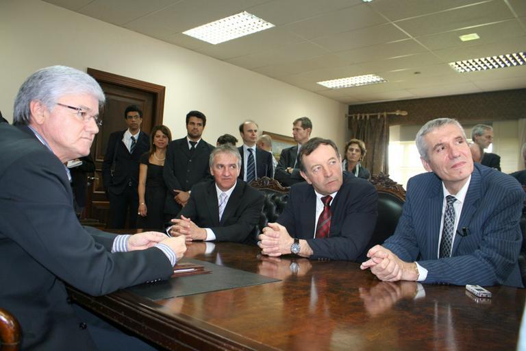 | Keywords: people indoor Empresários franceses visitaram nesta quinta-feira (10) o presidente da Assembleia Legislativa do Paraná, Valdir Rossoni (PSDB). A comitiva da empresa Limagrain está no estado para concretizar uma parceria com a Sementes Guerra S/A, do empresário Luiz Fernando Guerra. Rossoni ressaltou a importância desta parceria para o Paraná e principalmente para a região sudoeste. “Tenho a certeza de que essa parceria irá prosperar. Somos parceiros políticos da família Guerra, que goza de grande prestígio no estado. Coloco o Poder Legislativo à disposição para que a união das duas empresas alcance os seus anseios”, disse o presidente. “Essa junção proporciona ao estado um momento histórico que trará grandes benefícios para o novo Paraná”, completou Rossoni. O diretor geral da empresa francesa, Daniel Chéron, destacou que o principal papel da Limagrain é o de colocar as melhores sementes no mercado que atua. Além da Europa, a Limagrain opera também nos Estados Unidos, China, Índia e Japão. “No Brasil temos a intenção de construir um grande pólo de culturas. O país se tornou importante para a nossa Companhia por ser o terceiro maior produtor de milho”, relatou Chéron. Essa foi a primeira comitiva internacional recebida pelo presidente Valdir Rossoni, que assumiu a Assembleia no último dia 1º. Além dos empresários franceses, a comitiva era composta por profissionais de mídia, dos jornais Le Figaro e Le Monde (França) e Zero Hora, além das revistas Isto É Dinheiro Rural e Seed News e da TV Itapuã de Pato Branco. Foto: Maria de Freitas / Assembleia Legislativa do Paraná Empresários franceses visitaram nesta quinta-feira (10) o presidente da Assembleia Legislativa do Paraná, Valdir Rossoni (PSDB). A comitiva da empresa Limagrain está no estado para concretizar uma parceria com a Sementes Guerra S/A, do empresário Luiz Fernando Guerra. Rossoni ressaltou a importância desta parceria para o Paraná e principalmente para a região sudoeste. “Tenho a certeza de que essa parceria irá prosperar. Somos parceiros políticos da família Guerra, que goza de grande prestígio no estado. Coloco o Poder Legislativo à disposição para que a união das duas empresas alcance os seus anseios”, disse o presidente. “Essa junção proporciona ao estado um momento histórico que trará grandes benefícios para o novo Paraná”, completou Rossoni. O diretor geral da empresa francesa, Daniel Chéron, destacou que o principal papel da Limagrain é o de colocar as melhores sementes no mercado que atua. Além da Europa, a Limagrain opera também nos Estados Unidos, China, Índia e Japão. “No Brasil temos a intenção de construir um grande pólo de culturas. O país se tornou importante para a nossa Companhia por ser o terceiro maior produtor de milho”, relatou Chéron. Essa foi a primeira comitiva internacional recebida pelo presidente Valdir Rossoni, que assumiu a Assembleia no último dia 1º. Além dos empresários franceses, a comitiva era composta por profissionais de mídia, dos jornais Le Figaro e Le Monde (França) e Zero Hora, além das revistas Isto É Dinheiro Rural e Seed News e da TV Itapuã de Pato Branco. Foto: Maria de Freitas / Assembleia Legislativa do Paraná |