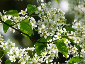 Keywords: common bird cherry black cherry tree flowers white spring bloom road leaves