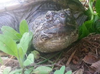 Keywords: Common snapping turtle in garden.jpg en A common snapping turtle relaxing in a garden 2014-06-08 16 21 28 own Agamemnus Chelydra serpentina