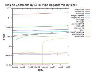 | Keywords: Commons MIME statistics bytes 2008-11-23 to 2009-07-06.svg en A logarithmic plot of the total file size in bytes by MIME type from formatdate 2008-11-23 to formatdate 2009-07-06 on Commons as gathered by MIMEStatBot own ; plotted with gnuplot based on raw data at http //toolserver org/~vyznev/stats/commons_mime_statistics_data txt Ilmari Karonen 2009-07-06 <gallery> File Commons MIME statistics files 2008-11-23 to 2009-07-06 svg By number of files </gallery> Other fields G + Notes Ogg audio and video files are listed as audio/ogg and video/ogg respectively even though the database currently lists both as application/ogg The image/x-xcf counts include files listed as unknown/unknown since they seem to be almost exclusively XCF files The application/zip files are almost exclusively OpenOffice documents Files of type image/x-ms-bmp have been listed separately despite not being an officially allowed file format on Commons since a considerable number of them still remain cc-zero Data in tabular format wikitable Date image/jpeg image/png audio/ogg image/svg+xml image/vnd djvu video/ogg image/gif application/pdf image/tiff image/x-xcf Other image/x-ms-bmp application/zip audio/midi - align right left formatdate 2008-11-23 2 332 221 103 737 102 726 419 242 47 097 841 642 28 013 135 625 11 263 667 127 10 886 920 136 14 816 016 938 4 719 393 753 0 151 229 679 180 099 913 164 262 232 15 084 555 10 959 651 - align right left formatdate 2008-11-30 2 355 330 609 359 103 324 250 934 47 516 168 582 28 231 971 738 13 553 238 968 11 036 725 155 11 565 338 497 4 761 460 218 0 148 576 478 177 324 731 164 262 232 15 084 555 10 978 164 - align right left formatdate 2008-12-07 2 380 074 907 204 104 196 251 563 48 281 942 321 28 377 102 257 14 283 960 820 12 093 527 848 11 328 694 814 4 853 476 532 0 148 576 478 178 282 919 164 262 232 15 084 555 10 985 074 - align right left formatdate 2008-12-14 2 404 870 938 610 104 771 933 726 48 994 973 485 28 597 623 069 14 618 763 327 12 354 278 815 11 382 577 559 6 820 297 619 0 148 706 468 178 347 574 164 262 232 15 084 555 11 010 023 - align right left formatdate 2008-12-21 2 427 440 875 764 105 263 912 074 49 273 663 545 28 818 460 855 15 281 608 415 12 408 525 250 11 455 705 632 6 844 629 481 0 131 782 857 208 008 354 164 101 498 15 084 555 11 010 022 - align right left formatdate 2008-12-28 2 453 433 978 685 105 848 915 162 49 275 571 014 28 956 190 743 16 059 242 515 12 538 376 194 11 570 454 171 8 760 675 306 0 131 782 857 207 871 336 164 101 498 15 084 555 11 003 917 - align right left formatdate 2009-01-04 2 483 876 977 575 106 499 313 413 49 387 362 672 29 171 516 707 16 938 878 132 12 701 197 078 11 503 919 983 9 180 333 297 0 129 781 786 215 099 761 163 402 852 15 084 555 11 006 683 - align right left formatdate 2009-01-11 2 509 707 472 845 107 299 412 858 49 450 069 524 29 382 281 278 17 418 310 734 13 081 379 855 11 536 885 756 9 186 841 347 0 129 814 585 207 373 661 163 402 852 15 084 555 11 021 632 - align right left formatdate 2009-01-18 2 534 249 604 490 107 614 862 244 49 511 777 368 29 600 562 453 17 707 522 352 13 669 772 667 11 577 045 722 9 342 152 992 0 130 526 977 325 039 029 162 404 014 15 082 888 11 021 632 - align right left formatdate 2009-01-25 2 556 953 433 071 108 429 006 223 49 715 998 495 30 011 032 207 18 109 662 537 15 519 397 599 11 521 044 700 9 398 784 122 0 129 985 958 227 733 764 161 361 778 15 082 888 11 045 486 - align right left formatdate 2009-02-01 2 585 097 041 135 109 150 089 976 49 830 013 615 30 903 747 334 19 287 251 705 16 474 609 035 11 419 150 816 9 466 785 653 0 129 793 314 224 985 623 160 607 470 15 082 888 11 019 222 - align right left formatdate 2009-02-08 2 609 848 013 509 110 098 550 728 49 942 459 404 31 192 711 263 19 686 565 591 16 916 922 210 11 488 340 459 9 712 840 415 0 138 697 261 222 368 253 160 607 470 15 082 888 11 033 858 - align right left formatdate 2009-02-15 2 639 459 921 360 113 140 037 470 48 032 481 691 31 851 686 740 20 566 252 147 17 078 305 976 11 543 245 039 10 070 169 400 0 130 237 265 224 525 291 160 607 470 15 082 888 11 035 255 - align right left formatdate 2009-02-22 2 668 983 709 579 115 747 653 245 48 183 097 795 32 248 987 678 21 545 063 799 17 374 433 417 11 636 202 554 9 828 230 333 0 132 146 297 246 381 547 160 607 470 15 082 888 11 044 362 - align right left formatdate 2009-03-01 2 694 601 352 970 118 262 958 468 48 327 675 912 32 566 908 103 21 842 340 343 17 687 195 807 11 704 318 298 10 083 797 640 0 131 729 987 246 384 783 160 607 470 15 082 888 11 073 319 - align right left formatdate 2009-03-08 2 741 696 467 139 119 405 878 325 48 639 854 739 32 876 558 375 22 663 047 907 19 595 840 139 11 751 191 608 10 170 221 194 0 132 689 928 246 384 783 160 607 470 15 082 888 11 073 712 - align right left formatdate 2009-03-15 2 855 375 894 097 121 665 503 068 49 119 817 029 33 192 340 644 23 331 891 226 20 933 536 185 11 826 277 287 10 281 764 891 0 132 689 928 241 164 331 158 970 004 15 082 888 11 052 143 - align right left formatdate 2009-03-22 2 897 386 385 827 122 395 572 382 49 658 606 135 33 979 825 727 24 168 422 096 21 198 718 057 11 883 672 512 10 832 034 365 1 537 498 919 133 116 692 238 937 767 158 970 004 15 082 888 11 061 683 - align right left formatdate 2009-03-29 2 929 296 356 105 123 111 524 053 49 975 583 281 34 331 862 037 24 518 239 101 21 423 376 809 12 048 127 207 10 925 414 108 3 195 133 438 133 116 692 246 993 510 158 970 004 15 082 888 11 066 240 - align right left formatdate 2009-04-05 2 968 059 044 608 123 644 491 163 50 255 686 255 34 631 255 812 24 849 769 276 21 717 269 993 12 062 475 751 11 121 722 367 3 701 086 004 133 245 703 244 631 386 158 970 004 15 082 888 11 115 003 - align right left formatdate 2009-04-12 3 017 035 395 637 124 544 619 298 51 267 591 944 34 860 334 993 25 083 478 488 21 871 472 086 12 082 933 142 11 208 890 080 4 184 675 041 133 988 005 248 760 260 158 970 004 15 082 888 11 115 003 - align right left formatdate 2009
