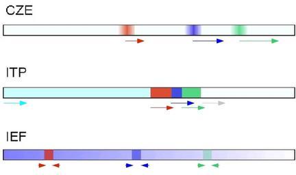 | Keywords: Comparison CZE ITP IEF.jpg en Comparison of some electrophoretic techniques namely zone electrophoresis isotachophoresis and iso-electric focusing Green blue red analytes rrows give an indication of the relative speed and direction of electrophoresis In zone electrophoresis the analytes are separated according to their electrophoretic mobilities In isotachophoresis the analytes are separated according to their electrophoretic mobilities but remain sandwiched between the terminating and leading electrophoresis In iso-electric focussing a pH-gradient is created and the analytes are focussed at the location where the pH matches their pI Own Josq 2008-11-22 Comparison_CZE_ITP_IEF svg Electrophoresis |