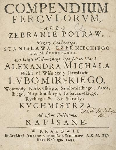 | Keywords: Compendium ferculorum.jpg langswitch Title page of Compendium ferculorum by Stanisław Czerniecki 1682 <br /> Full text <blockquote><poem> Compendium Ferculorum or A Collection of Dishes by the noble-born Stanisław Czerniecki Secretary to His Royal Majesty and Head Chef to the Right Honourable Aleksander Michał Lubomirski Count of Wiśnicz and Jarosław Voivode of Kraków Starosta of Sandomierz Zator Niepołomice Lubaczów Ryki etc etc written for public use In Kraków at the printing shop of Jerzy and Mikołaj Schedl Typographers to His Royal Majesty A D 1682 </poem></blockquote> Strona tytułowa Compendium ferculorum Stanisława Czernieckiego 1682 r <br /> Pełny tekst pisownia oryginalna <blockquote><poem> Compendium Fercvlorvm Albo Zebranie Potraw Przez Vrodzonego Stanisława Czernieckiego I K M Sekretarza A iaśnie Wielmoznego Iego Mośći Paná Alexandra Michala Lvbomirskiego Woiewody Krákowskiego Sandomirskiego Zator skiego Niepołomskiego Lubáczewkiego Ryckiego c c Stárosty Kvchmistrza Ad usum Publicum napisane W Krakowie W Drukárni Jerzego y Mikołaia Schedlow I K M Typ Roku Panskiego 1682 </poem></blockquote> http //polona pl/item/3490233/4/ Polona pl Author 2010-01-20/1682 PD-OLD 1682 Title pages from Poland Stanisław Czerniecki Cookbooks from Poland Nowy Wiśnicz Castle PD-old |