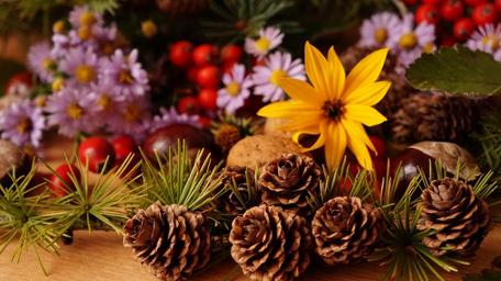 Keywords: composition plants flowers fruit rowan ornamental sunflower astra chestnut cones nature decoration