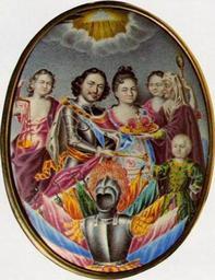 | Keywords: Conclusia for the Order of succession (1717, Hermitage).jpg en Allegory of the Order of succession Конклюзия на п естолонаследие Г С усикийский иниатю а на эмали 1717 Э митаж Изоб ажены Пет I Екате ина сп ава их сын ца евич Пет Пет ович 1715 1719 на кото ого Пет указывает скипет ом знаком импе ато ской власти что символизи ует назначение ца евича наследником п естола вместо ста шего сына от пе вой жены Пет а ца ицы Евдокии Лопухиной ца евича Алексея 1690 1718 иниатю а была выполнена по заказу еншикова еще до официального объявления Пет а Пет овича наследником 1718 Женская фигу а с зе калом сп ава аллего ия истины; слева с весами аллего ия п авосудия едь Эмаль 10 8X8 2 РР-3824 Конклюзия на п естолонаследие как и по т еты Екате ины I Анны Ивановны и А Д еншикова из соб ания Э митажа п иписывается художнику на основании стилистического анализа и а хивных документов http //museums artyx ru/books/item/f00/s00/z0000013/st003 shtml 1717 усикийский PD-old-100 Family of Peter I of Russia Catherine I of Russia in portrait miniatures Petr Petrovich 0 Peter I of Russia in portrait miniatures Imperial portrait miniatures in the Hermitage 18th-century portrait paintings in the Hermitage Romanovs Grigory Musikiysky 1710s portrait miniatures of Russia Family portraits of Russian rulers Group portraits with 6 persons Ermine clothing in art |