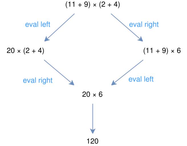 Keywords: Confluence example expression.svg en Confluence example expression ‹ 11 + 9 × 2 + 4 2016-12-30 own Cedar101 other versions \begin array rcccl \color MidnightBlue \text eval left 11+9 \times 2+4 \color MidnightBlue \text eval right \\ \color MidnightBlue \swarrow \color MidnightBlue \searrow \\ 20\times 2+4 11+9 \times 6\\ \color MidnightBlue \searrow \color MidnightBlue \swarrow \\ \color MidnightBlue \text eval right 20 \times 6 \color MidnightBlue \text eval left \\ \color MidnightBlue \downarrow \\ 120 \\ \end array cc-zero Term rewriting systems