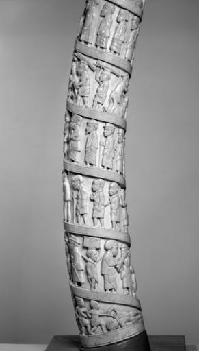 | Keywords: Congolese - Elephant Tusk with Scenes of African life - Walters 71586 - View F.jpg The tusk is carved in high relief with a procession of figures in a rising spiral It is thought to have been carved by the Vili people of Loango for the French traders who dominated the area The scenes which read from the bottom show a war between two African peoples in which the defeated are roped and led away; a sailor woodworking; coconuts being picked; a trader selling gin; prisoners being led off for sale as slaves; a European lighting his cigar; fishermen carrying large fish; a procession of dignitaries; the execution of criminals; goods and ivory being brought for sale; another procession of dignitaries who salute a European in a wicker chair; the preparing of a pig and other food for a banquet; a procession; the arrest of a wrong-doer; a procession; and an execution The top is carved with a gorilla eating a banana and scratching his side The costumes suggest a mid-century date and the Africans in the procession are shown in printed European cotton textiles There are many distinctions in rank among the Africans as indicated by their costume hats and jewelry and by specific symbols for example an umbrella Other similar tusks are known the earliest of which was purchased between 1839 and 1867 by the French admiral Fleuriot de Langle between 1850 1860 ivory cm 108 22 4 10 1 accession number 71 586 10458 Tiffany Company New York date and mode of acquisition unknown Henry Walters Baltimore ca 1910 by purchase Walters Art Museum Henry Walters Acquired by Henry Walters ca 1910 Through African Eyes The European in African Art 1500-Present The Detroit Institute of Arts Detroit; The Nelson-Atkins Museum of Art Kansas City 2010-2011 place of origin Loango Congo Walters Art Museum license Art of the Congo Basin African ivory Collections of the Walters Art Museum Media contributed by the Walters Art Museum needs category review |