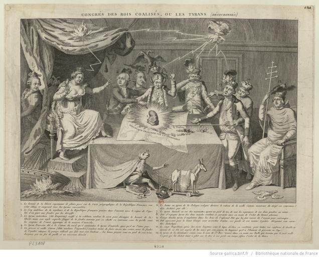 | Keywords: Congres des rois coalises.jpg Artwork Barnabé Augustin de Mailly 1732-179 LangSwitch A French emblematical design with numbers referring to an explanation engraved below the print The sovereigns of Europe surround a rectangular council-table on three sides On the table is a map inscribed ˜République française une et indivisible ™ in the centre of which is a cap of liberty emitting rays ; A cock enters by an oval window above the door grasping a level which emits flames and thunderbolts directed against the crowns of Catherine II Francis II Charles IV and George III ; Immediately behind '1' stands Francis II his crown clutched by a double-headed Habsburg eagle falls from his head; serpents emerge from it One hand holds the map the other is raised with a predatory ; Beside him left is Frederick William II pointing to the map his left hand on the shoulder of Francis II looking round at Catherine II who is seated at the head of the table; his broken crown falls from his head ; On a throne left on a dais and under a canopy of heavy draperies sits Catherine II her left foot planted on the council-table her arms held out towards the map ; The dismasted ship and burning straw are in the foreground on the extreme left Behind Catherine lurking in the draperies of her throne stands Stanislaus II of Poland on the extreme left frowning over his shoulder at the council-table his crown is broken ; Between and behind 3 and 4 is Victor Amadeus III of Savoy his crown obscured and displaced by a small solid cloud; he has a grotesquely long nose ; Charles IV his crown on fire and horns sprouting from his forehead stands beside Francis II his hand held before his face Next right at the end of the table facing Catherine stands George III his crown on fire and threatened by a small solid cloud his expression one of foolish vacuity Before him on the table are piles of coins which extend across the map of France; he holds two in his right hand which rests on the table Behind him stands Pitt his fingers ending in talons his legs in hoofs; he directs the King's actions and pushes a hooked pole resembling a boat-hook on to the map beside 'Toulon' They are ; On the extreme right sits the Pope holding his triple cross his crown partly obscured by a small cloud In his left hand he holds a scroll headed 'Bulle' and ending with 'nulle' At his feet the dove of the Saint-Esprit the head irradiated lies dead ; In the foreground emerging from under the table-cloth is a monkey Ferdinand IV of Naples the order of the Golden Fleece hung round his neck; he looks towards the Pope Beneath him is a damaged heraldic shield with the arms of the House of Bourbon On the ground beside him are a toy horse on wheels and a crown pierced by a stag's antlers ; The annual tribute of a white hackney from the King of Naples to the Pope had been abolished in 1776 Caricature avec des numéros faisant référence à une explication gravée en dessous Les souverains de l'Europe tiennent une réunion sur les trois côtés d ™une table Sur celle-ci se trouve une carte sur la quelle est inscrite « République française une et indivisible » au centre émergeant des cieux se trouvent les éclairs de la liberté 1794 6 5 Technique etching stipple engraving Size cm 51 39 Institution Bibliothèque nationale de France département Estampes et photographie place of discovery object history exhibition history credit line fr fr Hould 1988</sup> This order was confirmed January 14 1794 with a deposit of 1 000 pounds<sup>Miller 2011</sup> It is delivered June 5 1794<sup>Hould 1988</sup> L ™estampe est commandée par le Comité de salut public le Date 1793 10 15 à 900 exemplaires 600 en noir 300 en couleur <sup>Hould 1988</sup> Cette commande est confirmée le 1794 1 14 avec un accompte de 1 000 livres<sup>Miller 2011</sup> Elle est livrée le 1794 6 5 <sup>Hould 1988</sup> Cf cite book Mary Ashburn Miller Cornell university press 3 Lightning Strikes A Natural History of Revolution Violence and nature in the french revolutionnary imagination 1789-1794 978-0-8014-4942-0 Ithaca and London Cornell university press 2011 85 en Miller <br> cite book Claudette Hould Michel Vovelle La Sorbonne La propagande d ™Ã©tat par l ™estampe durant la Terreur Les images de la Révolution française 2 2-8594-4161-0 Paris La Sorbonne 1988 30-37 fr Hould Congres de rois coalises jpg 100 accession number RESERVE QB-370 26 -FT 4 De Vinck 4358 place of creation ark /12148/btv1b6948182n PD-GallicaScan PD-old-100 Catherine II of Russia in engravings George III of the United Kingdom Frederick William II of Prussia Stanislaus II August of Poland Victor Amadeus III of Sardinia Charles IX of France William Pitt the Younger Pius VI Ferdinand I of the Two Sicilies French Revolution in art Prints on the French Revolution Caricatures on the French Revolution |