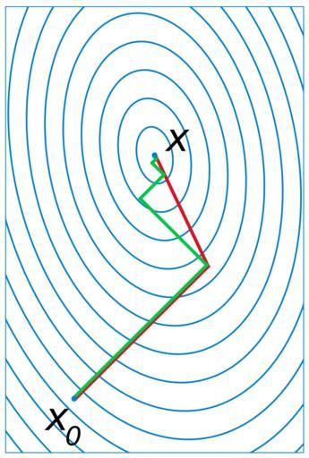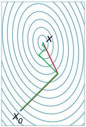 | Keywords: Conjugate gradient illustration.svg Illustration of en Conjugate gradient method self-made with en Matlab and then tweaked in en Inkscape 01 49 20 June 2007 UTC Oleg Alexandrov Source code MATLAB <source lang Matlab > A comparision of gradient descent and conjugate gradient guess who wins function main data A 17 2; 2 7; the matrix b 2 2'; right-hand side x0 0 0'; the initial guess linewidth and font size lw 2; fs 25; colors red 0 867 0 06 0 14; blue 0 129 205/256; green 0 200 70/256; black 0 0 0; white 0 99 1 1 1; Set up the plotting window figure 1 ; clf; set gca 'fontsize' fs ; hold on; axis equal; axis off; s 0 16; x A\b; Ax x 1 -s; Bx x 1 +s; Ay x 2 -2 0 s; By x 2 +s; plot Ax Bx Bx Ax Ax Ay Ay By By Ay 'color' blue 'linewidth' lw/2 ; plot a blue box s 0 005; plot Ax-s Ay-s ' ' 'color' white ; plot Bx+0 5 s By+0 5 s ' ' 'color' white ; markers Box Ax Bx Ay By; axis Box ; plot the contours of the quadratic form associated with A and b plot_contours A b Box lw blue ; Do conjugate gradient and gradient descent For the first one start a bit shifted so that the two graphs don't overlap shift 0 0015 1 -1; small_rad 0 002; tol eps; x conj_gradient A b x0 tol lw red small_rad shift ; x grad_descent A b x0 tol lw green small_rad ; text small 0 015; text x0 1 -2 small x0 2 -1 6 small 'x' 'fontsize' fs ; text x0 1 -0 5 small x0 2 -3 small '0' 'fontsize' floor 0 7 fs ; text x 1 +small x 2 +small 'x' 'fontsize' fs ; some balls for beauty small_rad 0 003; ball x0 1 +shift 1 /2 x0 2 +shift 2 /2 small_rad blue ball x 1 x 2 small_rad blue save to disk as eps and svg saveas gcf 'Conjugate_gradient_illustration eps' 'psc2' ; plot2svg 'Conjugate_gradient_illustration svg' ; function x conj_gradient A b x tol lw color small_rad shift r A x - b; d -r; while norm r > tol a pretty ball for beauty to cover imperfections when two segments are joined ball x 1 +shift 1 x 2 +shift 2 small_rad color ; alpha -dot r d /dot A d d ; x0 x; x x + alpha d; r A x - b; beta dot A r d /dot A d d ; d0 d; d -r + beta d; plot x0 1 x 1 +shift 1 x0 2 x 2 +shift 2 'color' color 'linewidth' lw end function x grad_descent A b x tol lw color small_rad r A x - b; d -r; while norm r > tol a pretty ball for beauty to cover imperfections when two segments are joined ball x 1 x 2 small_rad color ; alpha -dot r d /dot A d d ; x0 x; x x + alpha d; r A x - b; beta 0; beta dot A r d /dot A d d ; d0 d; d -r + beta d; plot x0 1 x 1 x0 2 x 2 'color' color 'linewidth' lw end function plot_contours A b Box lw color ; N 200; number of points don't make it big code will be slow E A\b; the exact solution around which we will draw the contours B 0 12; X Y meshgrid linspace Box 1 -B Box 2 +B N linspace Box 3 -B Box 4 +B N ; X and Y coordinates the quadratic form f 1/2 x' A X-b' x; f inline '0 5 A 1 1 X X + A 1 2 X Y+0 5 A 2 2 Y Y-b 1 X-b 2 Y' 'X' 'Y' 'A' 'b' ; Z 0 5 A 1 1 X X + A 1 2 X Y+0 5 A 2 2 Y Y-b 1 X-b 2 Y; prepare to draw the contours x0 A\b; f0 f x0 1 x0 2 A b ; No 25; number of contours Levels linspace f0 1 No -f0 2+f0; Plot the contours with 'contour' in figure 2 and then with 'plot' in figure 1 This is to avoid a bug in plot2svg it can't save output of 'contour' figure 2 ; clf; hold on; for i 1 length Levels figure 2 ; c stuff contour X Y Z Levels i Levels i ; m n size c ; if m > 1 n > 0 extract the contour from the contour matrix and plot in figure 1 l c 2 1 ; x c 1 2 l+1 ; y c 2 2 l+1 ; figure 1 ; plot x y 'color' color 'linewidth' lw/2 ; end end figure 1 ; function ball x y r color Theta 0 0 1 2 pi; X r cos Theta +x; Y r sin Theta +y; H fill X Y color ; set H 'EdgeColor' 'none' ; </source> Numerical analysis Optimization Images with Matlab source code Files by User Oleg Alexandrov from en wikipedia |
