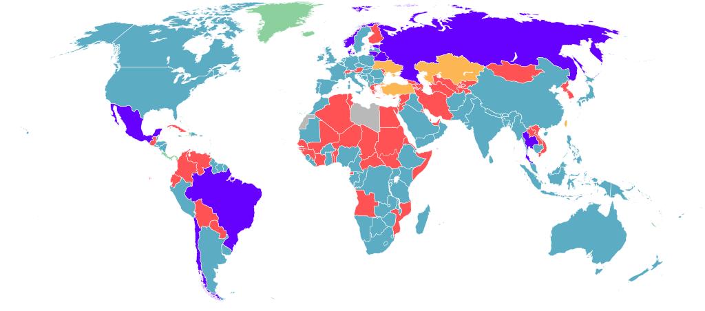 | Keywords: Conscription map of the world.svg conscription <font color 00d000 >Green</font> Countries that don't have any armed service <font color 0000c8 >Blue</font> Countries that don't have conscription <font color 6600ff >Purple</font> Countries that have active draft system but less than 20 of the whole age group are compelled to enlist <font color ff9000 >Orange</font> Countries where the current government is planning to abolish conscription <font color ff0000 >Red</font> Countries that have conscription ar خريطة تبين وضع الخدمة العسكريةالإلزامية لكل دولة <font color 00d000 >أخضر</font> دول ليس لديها قوات مسلحة <font color 0000c8 >أزرق</font> دول لا تتبنى الخدمة العسكرية الإزامية <font color ff9000 >برتقالي</font> دول تخطط لإلغاء الخدمة العسكرية الإلزامية خلال ثلاث سنوات <font color ff0000 >أحمر</font> دول تتبنى الخدمة العسكرية الإلزامية военна повинност доб оволна / п офесионална а мия <font color ff9000 >О анжево</font> Плани ано п емахване на военната повинност в следващите 3 години <font color ff0000 >Че вено</font> Военна повинност he מפה המתארת את יחס מדינות העו כ פי גיוס חובה <font color 00d000 >ירוק</font> א צבא <font color 0000c8 >כחו </font> א גיוס חובה גיוס התנדבותי/צבא מקצועי <font color ff9000 >כתו </font> גיוס חובה קיימת תוכנית בט את גיוס החובה בתוך ש וש שני <font color ff0000 >אדו </font> קיי גיוס חובה <font color 909090 >אפור</font> חסר מידע cs Mapa světa podle druhu armády <font color 00d000 >Zelený</font> Bez armády <font color 0000c8 >Modrý</font> Bez odvodů dobrovolná/profesionální armáda <font color ff9000 >Oranžový</font> Povinné odvody ale je rozhodnuto o jejich zrušení v brzké budoucnosti < 3 roky <font color ff0000 >Červený</font> Povinné odvody da Kort over hærformerne i verden <font color 00d000 >Grøn</font> Ingen hær <font color 0000c8 >Blå</font> Ingen værnepligt forsvar af frivillige/professionel hær <font color ff9000 >Orange</font> Stadig værnepligt men under afvikling <font color ff0000 >Rød</font> Værnepligt Wehrpflicht Freiwilligenarmee / Berufsarmee <font color ff9000 >Orange</font> noch Wehrpflicht aber eine Abschaffung in naher Zukunft < 3 Jahren ist bereits beschlossen <font color ff0000 >Rot</font> Wehrpflicht el Σημασία Χρωμάτων <font color 00d000 >Πράσινο</font> Χωρίς Ένο λες Δυνάμεις <font color 0000c8 > λε</font> Χωρίς υ οχρεωτική θητεία εθελοντικός/ε αγγελματικός στρατός <font color ff9000 >Πορτοκαλί</font> Κατάργηση της θητείας στο άμεσο μέλλον < 3 έτη <font color ff0000 >Κόκκινο</font> Υ οχρεωτική θητεία es Mapa mundial de los tipos de ejército <font color 00d000 >Verde</font> Sin ejército <font color 0000c8 >Azul</font> Servicio Militar Volutario <font color ff9000 >Naranja</font> Servicio militar obligatorio pero de próxima abolición en menos de tres años <font color ff0000 >Rojo</font> Servicio militar obligatorio fa انواع مختلف نیروهای مسلح در جهان <font color 00d000 >سبز</font> بدون نیروهای مسلح <font color 0000c8 >آبی</font> بدون خدمت سربازی ارتش داوطلبی / حرفه ای <font color ff9000 >نارنجی</font> دارای خدمت سربازی، در حال حذف در کمتر از ۳ سال <font color ff0000 >سرخ</font> دارای خدمت سربازی fi Kartta asepalveluksen pakollisuudesta eri puolilla maailmaa <font color 00d000 >Vihreä</font> Ei asevoimia <font color 0000c8 >Sininen</font> Ei asevelvollisuutta <font color 6600ff >Violetti</font> Kutsunnat käytössä mutta alle 20 koko ikäluokasta pakotetaan palvelukseen <font color ff9000 >Oranssi</font> Asevelvollisuuden poistaminen suunnitteilla <font color ff0000 >Punainen</font> Asevelvollisuus conscription dans le monde colorbox 00d000 Pas d'armée nationale <br/> SteelBlue Pas de conscription ou pas appliquée armée volontaire et/ou de métier <br/> 6600ff Appliquée mais moins de 20 ont en pratique l'obligation de s'enrôler <br/> Orange Obligatoire mais une suspension ou suppression est planifiée <br/> Red Obligatoire hu A világ hadseregtípusainak térképe <font color 00d000 >Zöld</font> Nincs fegyveres ereje <font color 0000c8 >Kék</font> Nincs sorozás önkéntes/hivatásos hadsereg <font color ff9000 >Narancssárga</font> Sorozás kevesebb mint három éven belül tervezett megszüntetéssel <font color ff0000 >Piros</font> Sorozás coscrizione <font color 00d000 >Verde</font> Paesi che non prevedono il servizio militare <font color 0000c8 >Blu</font> Paesi che non adottano la coscrizione <font color ff9000 >Arancione</font> Paesi che prevedono di abolire la coscrizione entro 3 anni <font color ff0000 >Rosso</font> Paesi che adottano la coscrizione ja 徴兵制度の世界 図 <font color 00d000 >緑</font> 軍隊を していない国家 <font color 0000c8 > </font> 志願制の国家 <font color ff9000 >オレンジ色</font> 3年以内に徴兵制廃止予定の国家 <font color ff0000 >赤</font> 徴兵制を施行している国家 <font color 6600ff >紫</font> 法律には徴兵制が定めているが実施しない国家 군 없 nl Kaart van de verschillende typen legers op de wereld <font color 00d000 >Groen</font> Geen leger <font color 0000c8 >Blauw</font> Leger van uitsluitend vrijwilligers en beroeps <font color ff9000 >Oranje</font> Dienstplicht maar er is besloten tot afschaffing ervan op korte termijn binnen minder d