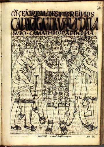 Keywords: Consejo Inca.jpg es El Inca rodeado de nobles representantes de los cuatro suyos Nueva Coronica y Buen Gobierno Felipe Guamna Poma de Ayala 1615 PD-old-100 Nobility Nueva corĂ³nica y buen gobierno