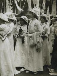 | Keywords: the women's library thewomenslibrary suffragette suffrage women hires 7JCC/O/02/072Photograph, printed, paper, monochrome, a group of Women's Social & Political Union (WSPU) members carrying poles with white triangular banners waiting to take part in the women's Coronation procession, Constance Lytton in the foreground; printed inscription on reverse 'Copyright Central News, 5 New Bridge St, London EC'. 7JCC/O/02/072Photograph, printed, paper, monochrome, a group of Women's Social & Political Union (WSPU) members carrying poles with white triangular banners waiting to take part in the women's Coronation procession, Constance Lytton in the foreground; printed inscription on reverse 'Copyright Central News, 5 New Bridge St, London EC'. |