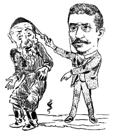 | Keywords: Constantin Jiquidi - Sache Petreanu, Foaia Populară, 14 feb 1899.JPG en Sache Petreanu the Romanian journalist and progressive Jewish activist One of the major contributors to the left-wing review Adevărul he is shown here trimming the payot of a traditionalist Jew - a reference to his advocacy of assimiliation into the Romanian mainstream A vocal critic of the Romanian governments at a time when mainstream Romanian politicians refused to enact the emancipation of Jews Petreanu had been expelled from Romania by the time this cartoon saw print 1899-02-14 Foaia Populară accessible through http //digitool dc bmms ro 8881/R RN 709438175 DacoRomanica Bucharest City Library Creator Constantin Jiquidi PD-old-100 Uploaded with UploadWizard Political cartoons by Constantin Jiquidi Caricatures of writers from Romania Journalists from Romania Jewish people of Romania Adevărul Payots 1899 cartoons 1890s political cartoons 1899 in Romania Fashion in 1899 |