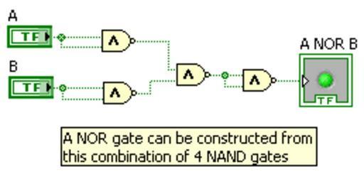 | Keywords: Constructing NOR gate from NAND gates.png en Example of how to construct a NOR gate from NAND gates own Skoch3 2010-01-07 This picture is incorrect You do not need the last nand gate; the last nand gate makes the picture false Alternative logic gates NOR gates NAND gate symbols |