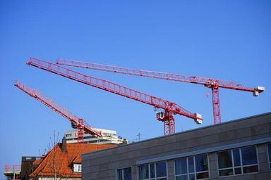 Keywords: construction cranes cranes site construction work red laying out crane boom above the rooftops of ulm ulm new ulm j banks flussmeisterei