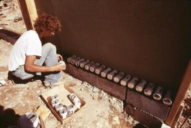 | Keywords: CONSTRUCTION OF ONE OF THREE EXPERIMENTAL HOUSES BUILT FROM EMPTY BEER AND SOFT DRINK CANS - NARA - 556637.jpg Scope and content CONSTRUCTION OF ONE OF THREE EXPERIMENTAL HOUSES BUILT FROM EMPTY BEER AND SOFT DRINK CANS ALL ALUMINUM CANS ARE BEING USED IN THIS CONSTRUCTION IN CONTRAST TO STEEL CANS BEING USED IN THE OTHER TWO DESIGNER MICHAEL REYNOLDS IS USING THE ALUMINUM CANS BECAUSE THEIR AVAILABILITY HAS INCREASED AN UNSKILLED WORKER IS LAYING ONE OF TWO THICKNESSES OF CANS WHICH WILL BE SEPARATED BY A VERTICAL SHEET OF FOAM INSULATION THE EXTERIOR WILL BE GLASS UNPAINTED CONCRETE AND EXPOSED CANS NEAR TAOS NEW MEXICO General notes 556637 Local identifier 412-DA-14185 Environmental Protection Agency 12/02/1970 - NARA-Author Hiser David 1937- Photographer 3651517 <br /> Taos Taos New Mexico United States North and Central America inhabited place 4203050 36 4 -105 57 <br /> Still Picture Records Section Special Media Archives Services Division NWCS-S National Archives at College Park 8601 Adelphi Road College Park MD 20740-6001 06/1974 Record group Record Group 412 Records of the Environmental Protection Agency 1944 - 2006 Record group ARC 708 DOCUMERICA The Environmental Protection Agency's Program to Photographically Document Subjects of Environmental Concern compiled 1972 - 1977 Series ARC 542493 File unit File unit ARC Variant control numbers Agency-Assigned Identifier 237/25/014185<br /> NAIL Control Number NWDNS-412-DA-14185 Other versions <gallery> File CONSTRUCTION_OF_ONE_OF_THREE_EXPERIMENTAL_HOUSES_BUILT_FROM_EMPTY_BEER_AND_SOFT_DRINK_CANS_-_NARA_-_556637 tif tif File CONSTRUCTION_OF_ONE_OF_THREE_EXPERIMENTAL_HOUSES_BUILT_FROM_EMPTY_BEER_AND_SOFT_DRINK_CANS_-_NARA_-_556637 jpg jpg </gallery> NARA-cooperation PD-USGov Construction in the United States Michael Reynolds architect Men at work in New Mexico Reynolds Recycling in the United States 1974 in New Mexico NARA images of New Mexico |